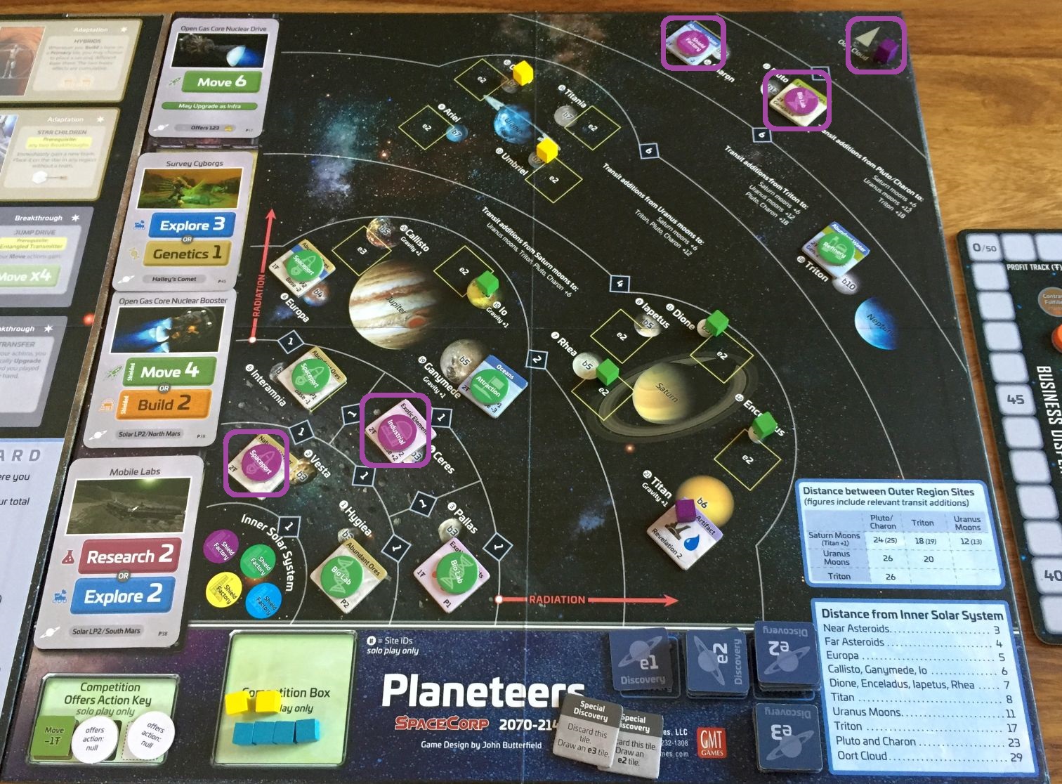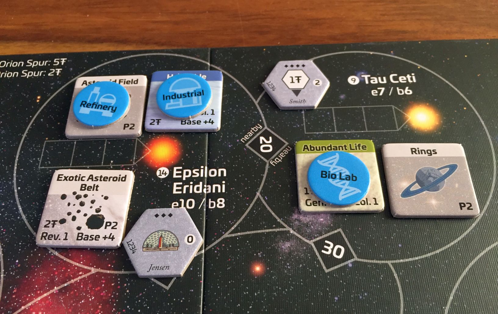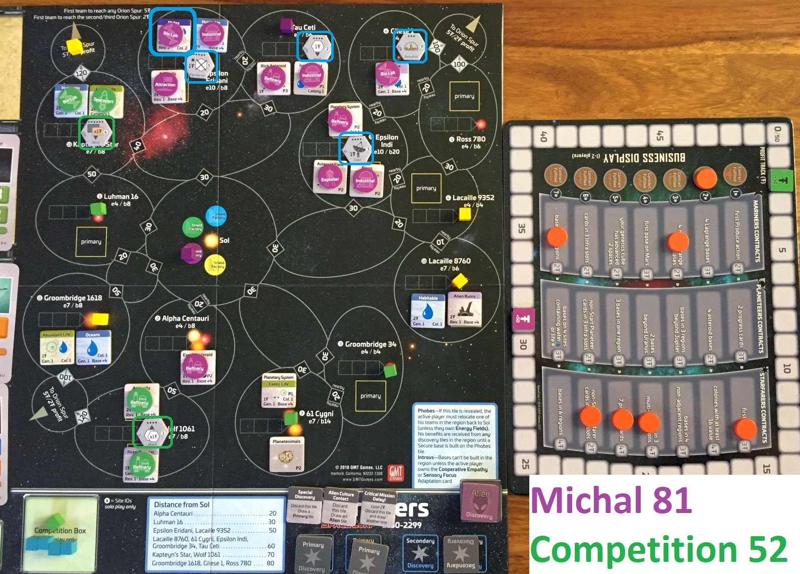 So I have played with standard rules, and in order to spice-up the game, I used the so called “Era Situations” expansionKnowing the game much better, I moved quickly to Mars and beyond to get the contracts for bases as well as benefits in next turn. Of course, my Infra was thoroughly upgraded (click to enlarge)Second epoch allowed me to extend the lead even more (click to enlarge)That was possible thanks to quick expansion to Pluto, and blocking the potential Competition contracts in Asteroid belt. Also, I got bonus for Starfarers epoch (click to enlarge)Last epoch was a masterpiece of my play. I was not able to use the adaptations but having multiple upgrades I managed to overcome it (click to enlarge)The Norther Sky was a base for my colonies – in four start systems. I especially liked the friendly Alien! But the competition also managed to colonize two systems in the galaxy (click to enlarge)