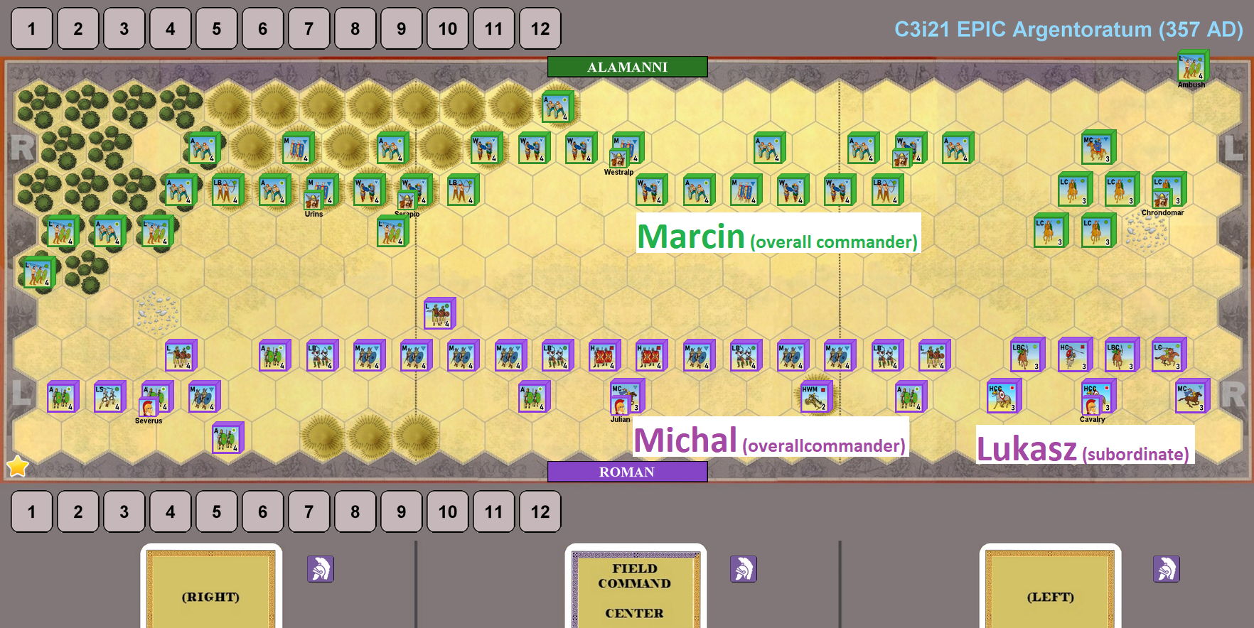 Usually, I like to play ancient battles in scenario groups, linked via theme, belligerents or area where it happened. As you may have already read, we played with Marcin and Lukasz Ancient Greece CCA EPICs, and now we decided to move 800 years forwards and try the struggle between Imperial Rome and Barbarians (Goths and Alamanni).