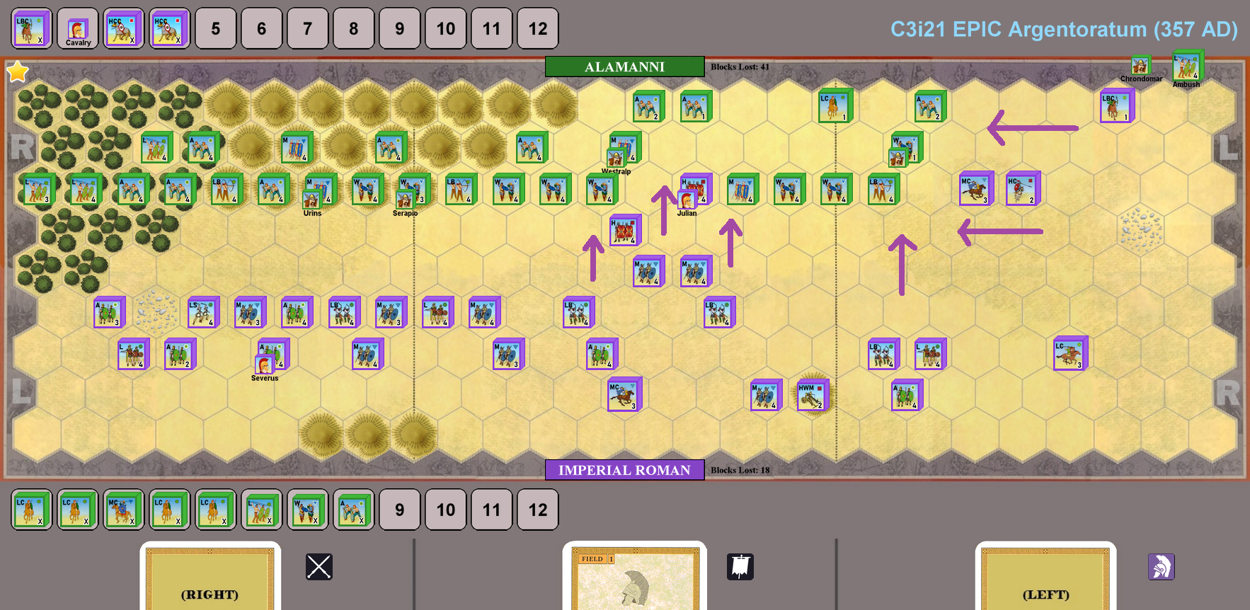 Julian looked for a quick knock-out punch with his cavalry, but Chnodomar’s trap worked well and much of the Roman cavalry retreated in disorder. Seeing this, the Alamanni charged along the whole length of their line, finally breaking through the Roman center. On the left, Severus finished off an ‘ambush’ placed for him in the woods and now flanked the enemy in the center, while the rallied Roman cavalry pressed in on the right. As the Roman wings overlapped, the Germans were compressed too tightly to battle effectively, and the army dissolved into rout.