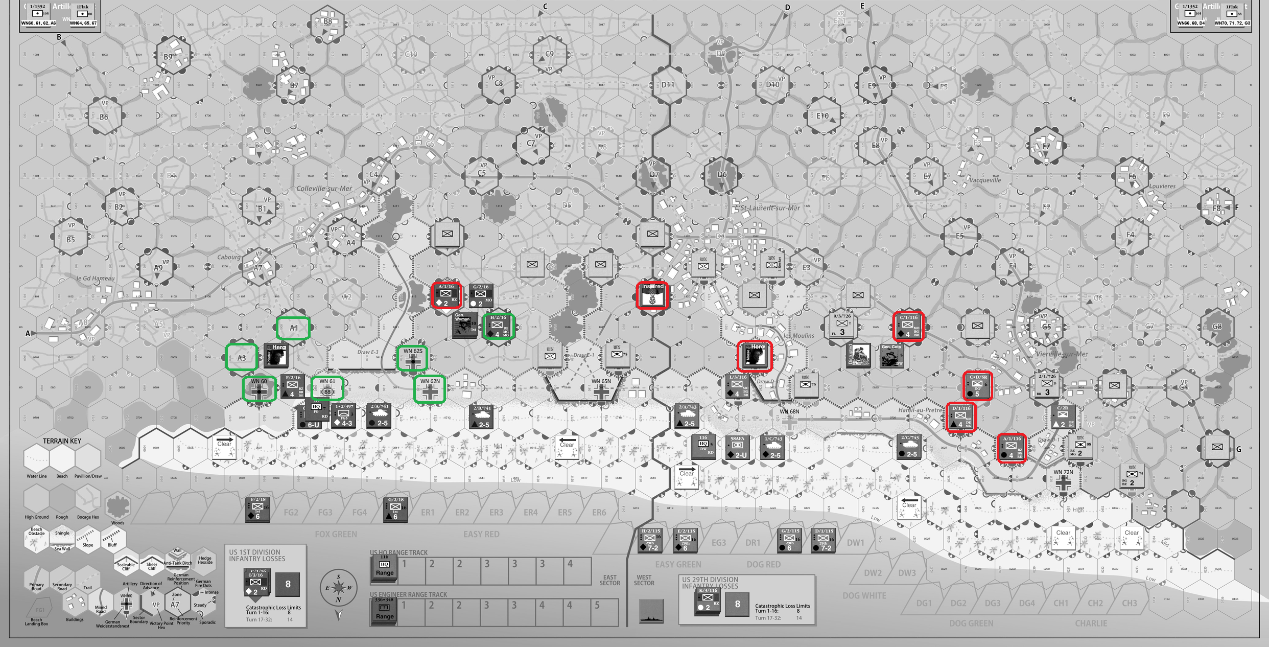 Mid Game summary: the landing goes really bad. Partially due to lack of luck (no heroes for so long) partially due to very accurate German fire in 29th Division sector. The only hope is in additional general and HQs – which hopefully will move things forward. Another good thing is that only 3 German reinforcements arrived so far. Let us see what happens next!