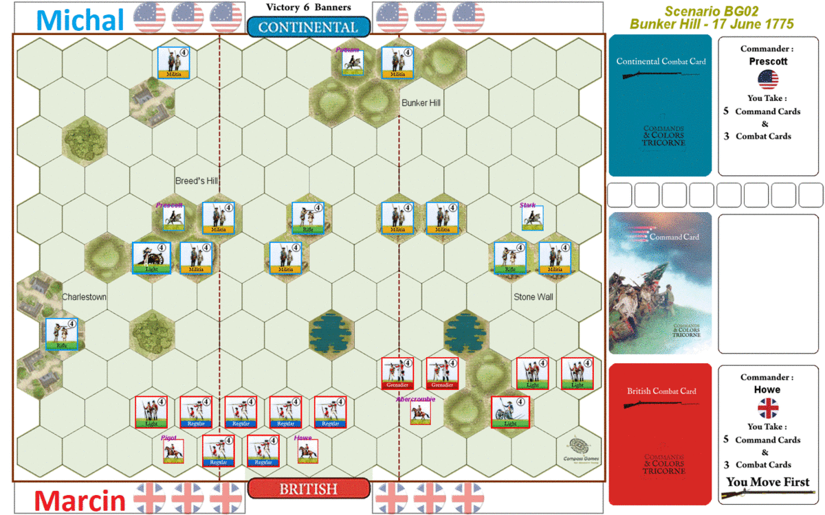 • The Breed’s hill is safe, no attack goes into that direction. However, in center the depleted continental forces makes a last stand at Bunker Hill.