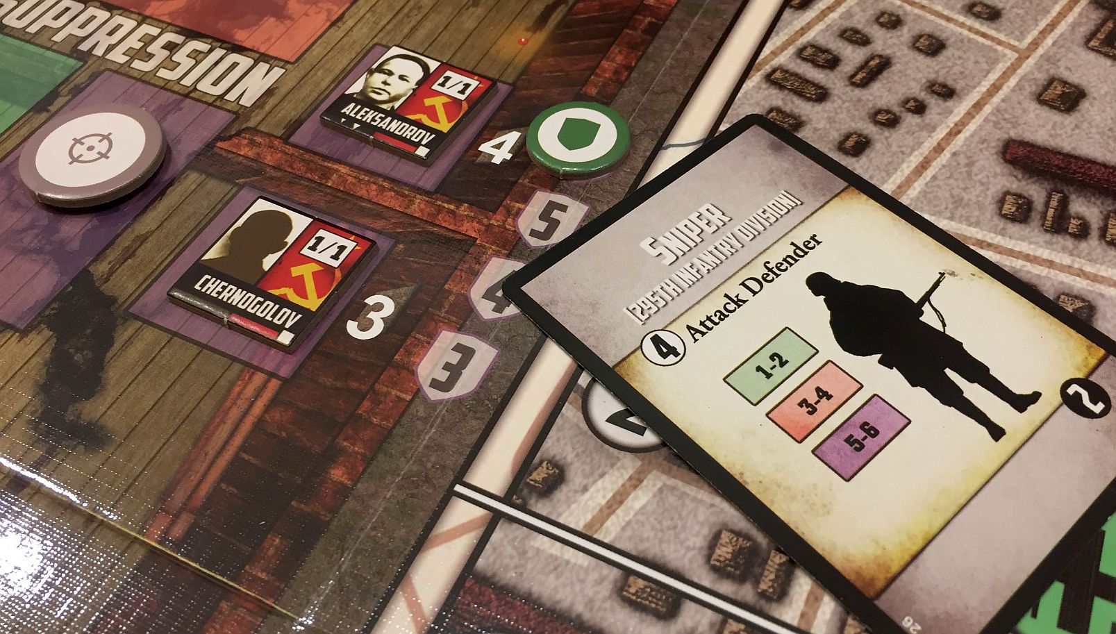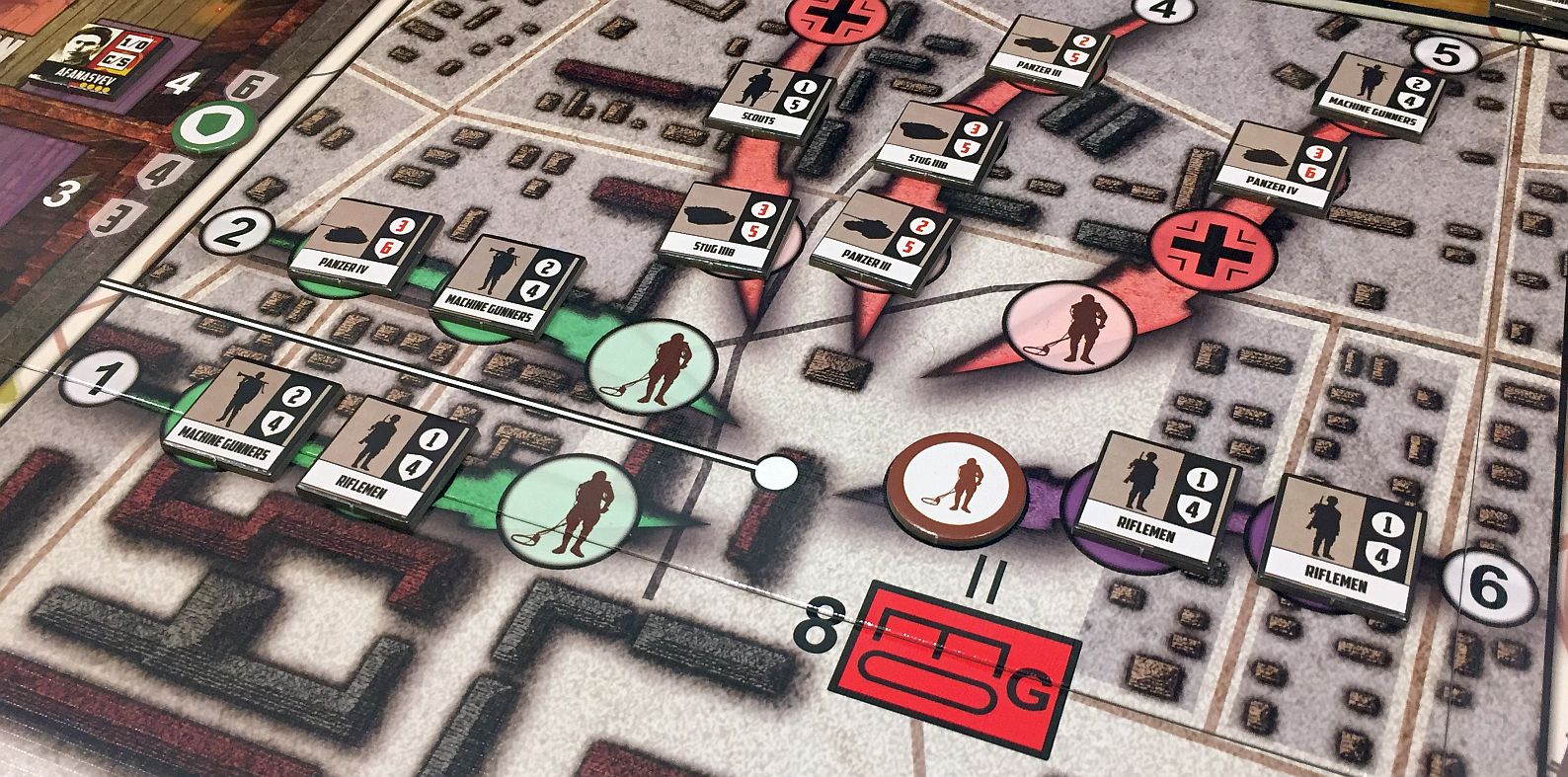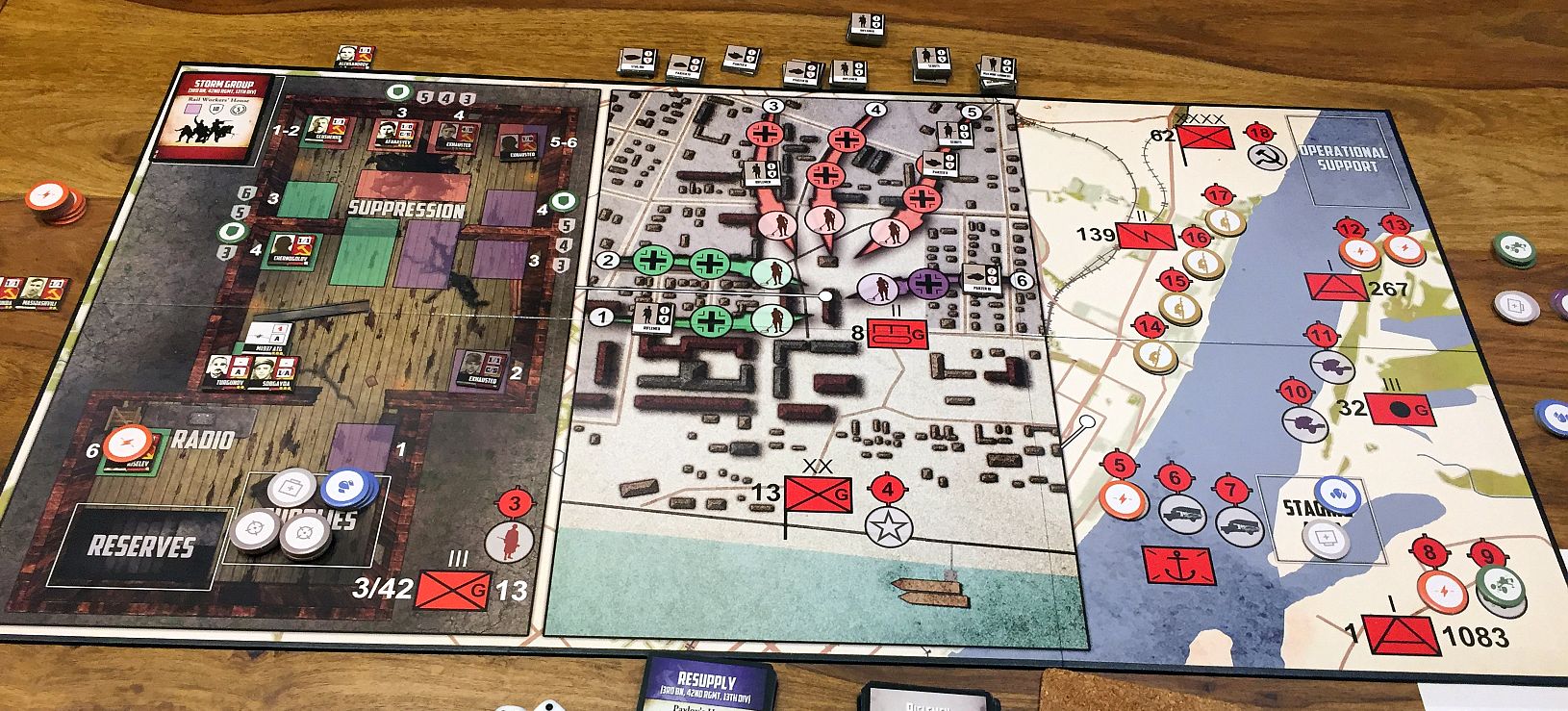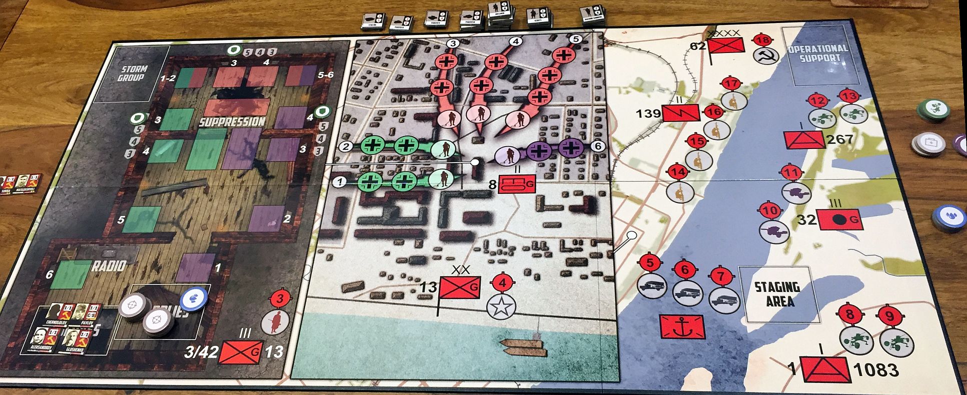 - operational perspective – on the left side of the board is a view inside of Pavlov’s House. The colored square areas are combat positions used by the Soviet Counters. This portion of the board is used for tactical-level movement of the Soviet Counters.
