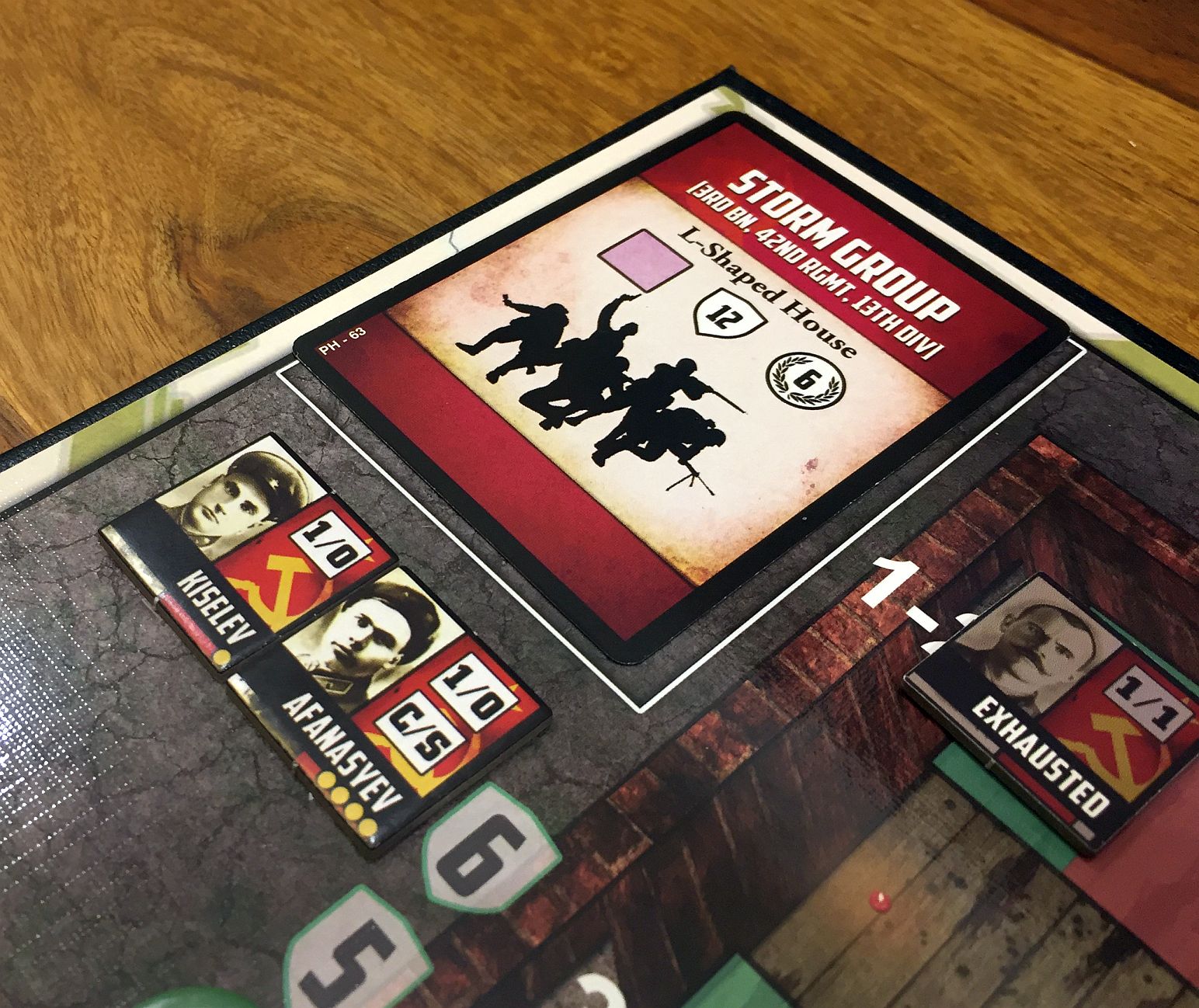 In classical, solo play you control strategical and operational perspective, while tactical one is played by the bot and its card deck. In 2 or 3 players, you can freely allocate command of those theaters to players. As I wanted to introduce that game to my best wargaming buddy, Jakub, I decided it would be fun to play as a team! Thus I took responsibility for Soviet 62nd Army while Kuba commanded defense of the House itself. We were about to face fierce attacks of the German enemy pretty soon!