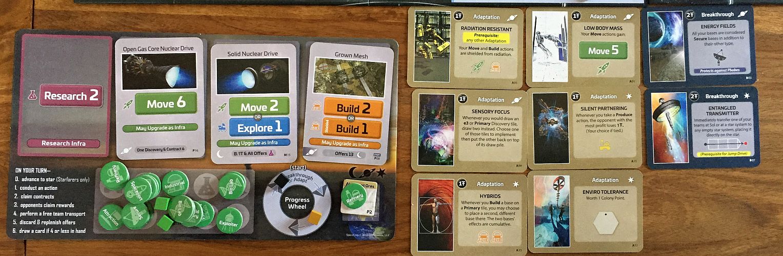 With the Planeteers Era the Spacecorp starts to shine. The are many more choices, area to explore is broader, the award tiles very intriguing. We start also to discover Adaptation / Breakthrough tiles. The amount of VPs also grows exponentially – so far it is pretty close in our game.