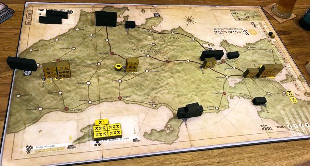 As for the uncertainty and no-dice-mechanism we have first of all: issues, which are placed hidden by the belligerents. On top of this, when resolving military expedition, sides commit strategos secretly, which directly translates into the strength and number of forces committed. Simple and elegant mechanics which makes use of dice unnecessary. If you have not tried this game yet, you definitely should.