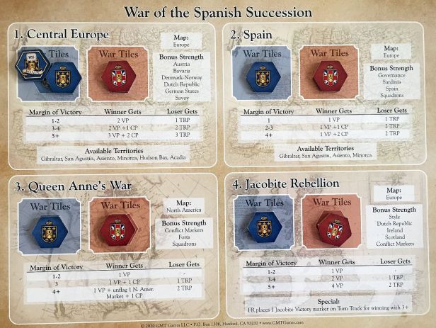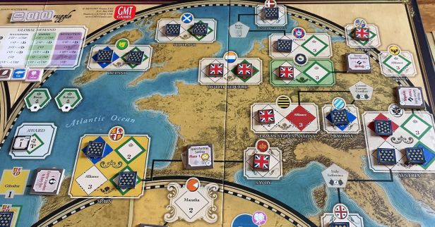 In short, it is a two-player game depicting the 18th-century rivalry between France and Britain. It covers almost 100 years (from 1697 till 1789), touching war, political, economical and diplomacy aspects. Unlike most Card Driven games, here you choose from common pool of investment tiles and only sometimes supplement it with event. Once you play event, it is removed from the game permanently.