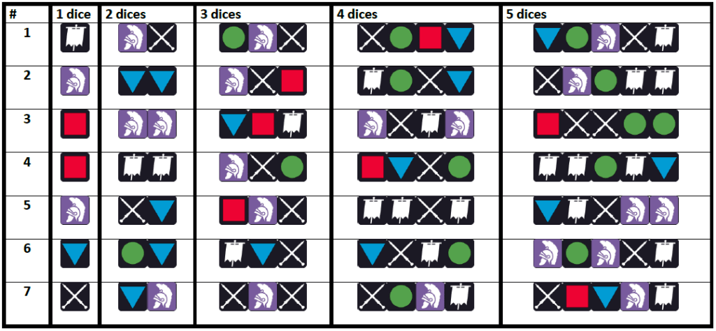 - You can change two dices during the game: one to Leader symbol and one to Flag. It can be done to any rolls: attack, battle back, leader check, evade, etc.