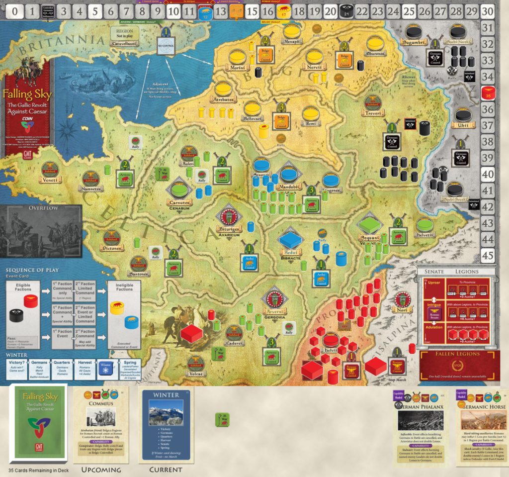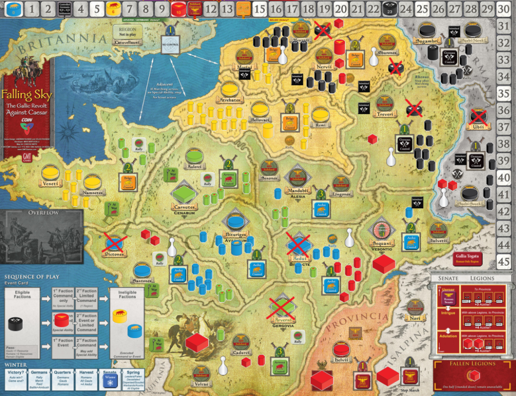 I have deep sentiment for Falling Sky as it was my first – and let us be honest – favorite COIN series game. Since it was published I had a lot of possibilities to play Base Game – live and via Vassal. When Ariovistus expansion was announced I immediately signed for this. Unfortunately, due to pandemic restrictions there was no possibility to organize face-to-face session. So when Brent contacted me with proposal for a VASSAL game, I immediately accepted.