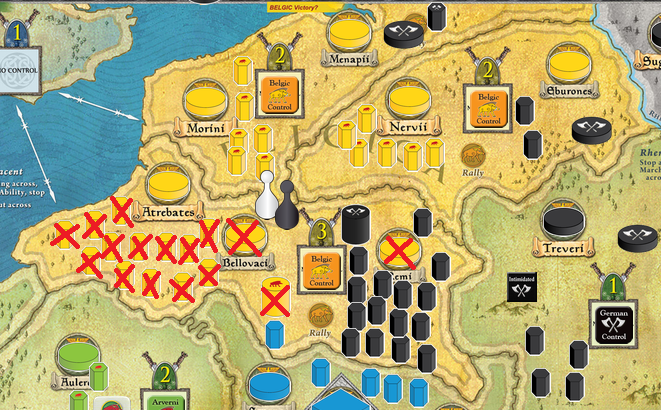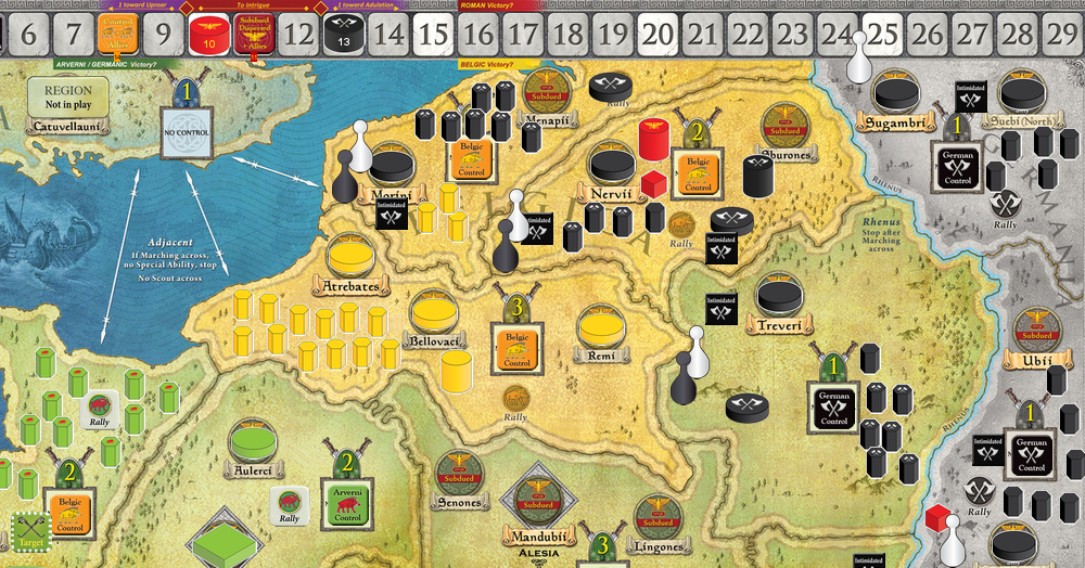 During our game we also concluded that for the Ariovistus host to have chance for victory they have to fight with their brethren – Belgae. It is made easier by the great German capability – Intimidate – and its prevention of Rally. It also allows to remove Allies immediately, resulting in scorched earth policy where only barbarians from behind the Rhenus can settle. Still, the victory conditions are very hard for that faction and rarely ever possible to achieve.