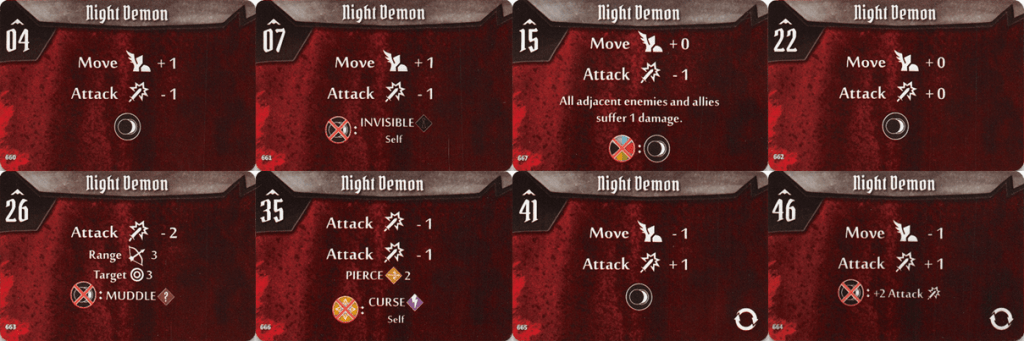 Pretty formidable enemy. A very fast (average initiative 25) and very predictable (maximum initiative 46) demon – we will see today one more such creature. Its hit points grow decently but the best of his skills is of course Disadvantage for whomever attacks him. For adventurers with thin attack deck and many rolling modifiers that can result in unexpected Nulls. If you look at the damage dealt by that opponent, it is also something to reckon with.