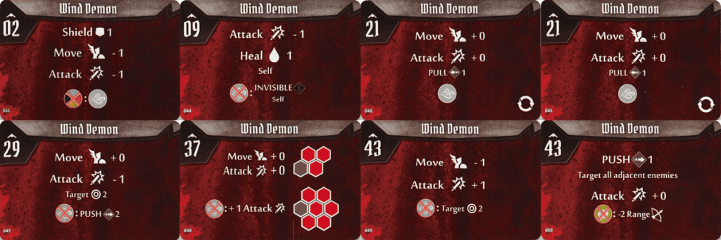 It can both attack and heal himself. Usually a very nasty opponent on higher levels as it can disarm you using the range attack, hiding behind the other monsters backs. And please observe it has “Attack” on every ability card plus sometimes it is multiple targets. I do not need to explain what would happen if most of your team is disarmed and unable to attack during the turn. What is even worse, Wind has a flying ability, so it can almost always move back and attack you without disadvantage for adjacency to target. You really would like to neutralize him at the first chance.