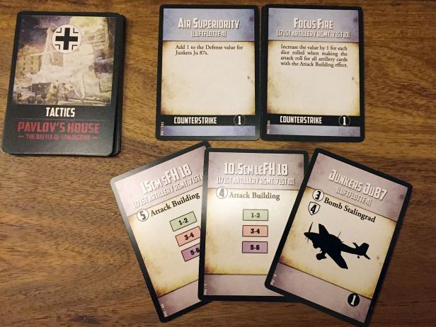 Recently I started to eagerly discover games by DVG (Dan Verssen Games), with special interest on Valiant Defense series. Today I would like to present the second installment in the series. In Pavlov’s House, we take control of the brave defenders of a Soviet strongpoint in Stalingrad as they hold out against constant German attacks for almost two months. We also control the key leaders throughout the Soviet 62nd Army that made the defense of Pavlov’s House possible. The goal in Pavlov’s House is to last through all the German attack waves, inflicting in the process as many casualties on attackers as possible. In the game, this is depicted by playing through a deck of cards representing elements of the German 6th Army. The Pavlov’s House map is divided in three key sections, each having its own rules as well as cards deck and interacting with others: