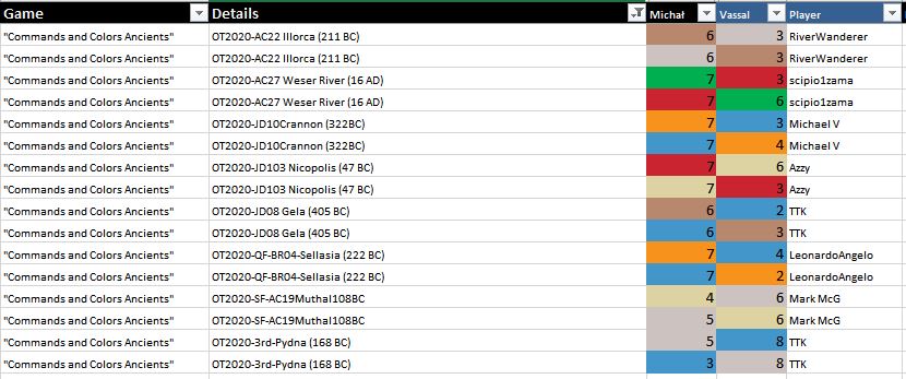 The first, started in March 2020, was Commands Colors Ancients Open Tournament 2020 (more details about CCA OT2020 here). This is a specific type of organized play in C&C world, where number of players is unlimited. This time we had whooping 33 participants! To manage such a number, we play in Swiss Tournament type, with 5 rounds, first being randomly decided and then from the second, pairing people by they rating. You can read about pairing here: VT Chess Swiss pairing system.