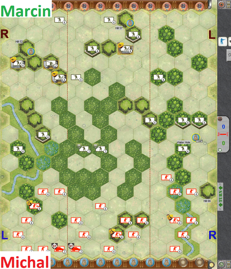 - I am slowly progressing in the center to make sure I can use the full fire-power when the time comes. Then, having good cards to assault and progress, I am moving forward on right, to take the woods directly next to the hill in the center.