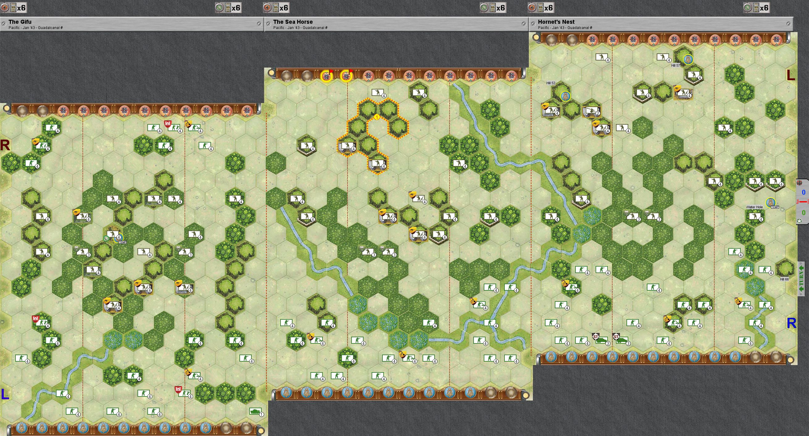 By December, the weary 1st Marine Division was withdrawn for recuperation, and over the course of the next month the U.S. XIV Corps took over operations on the island. This corps consisted of the 2nd Marine Division and the U.S. Army’s 25th Infantry and 23rd “Americal” Divisions. On 18 December, Allied forces began attacking Japanese positions on Mount Austen. A strong Japanese fortified position, called the Gifu, stymied the attacks and the Americans were forced to temporarily halt their offensive on 4 January. The Allies renewed the offensive on 10 January, re-attacking the Japanese on Mount Austen (scenario NS13) as well as on two nearby ridges called the Seahorse (scenario NS14) and the Galloping Horse (scenario NS15). And that is where our campaign begins.
