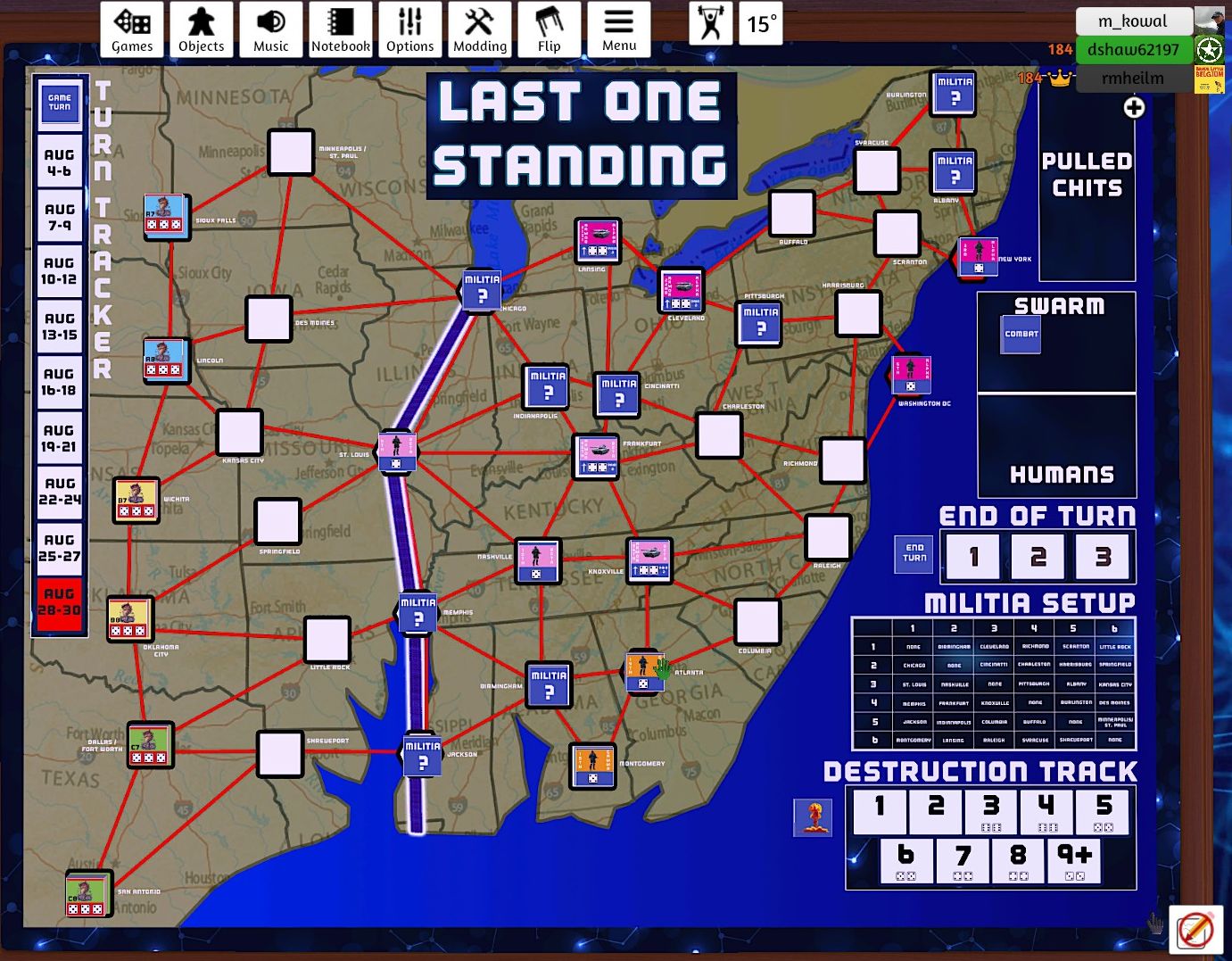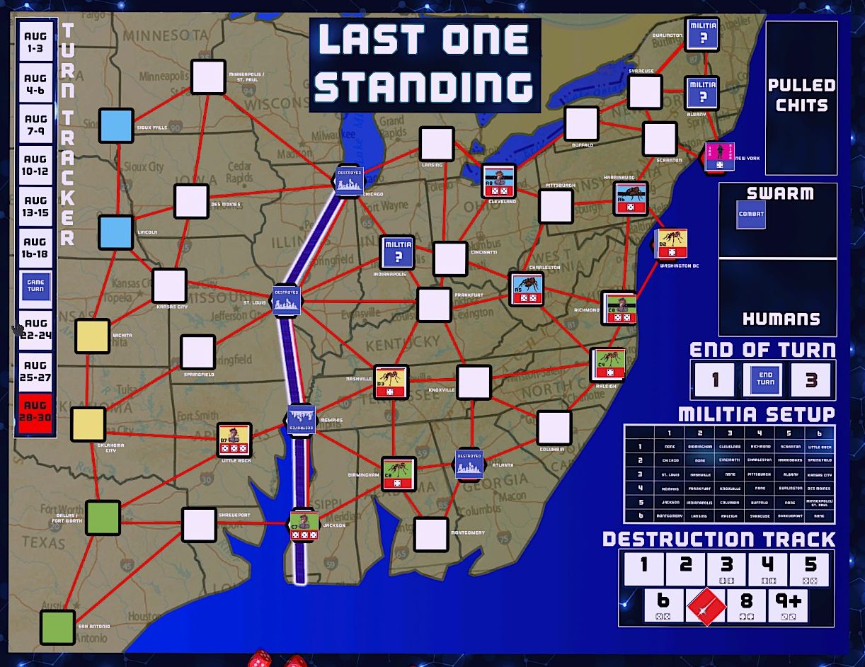 - Chit-pull mechanism – the Last One Standing uses as far as mechanics are concerned a standard chit-pull, with both sides divided into three separate armies, bunch of events plus three End Turn markers. The game lasts 10 turns but can finish immediately once Swarm occupies at least two special research facilities.