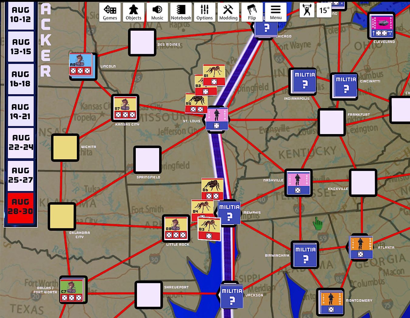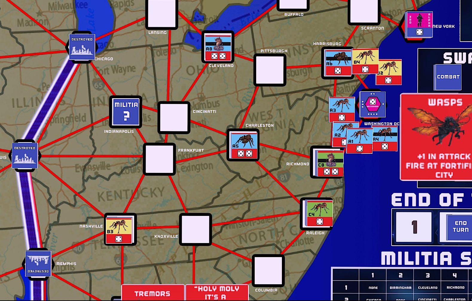 - Forces – human forces are finite, and when you take a hit it is forever. On the other hand each killed swarm comes back in two turns at the westernmost edge of the map. Humans have also Militia which is randomly placed at the beginning of the game, making each session a different experience.