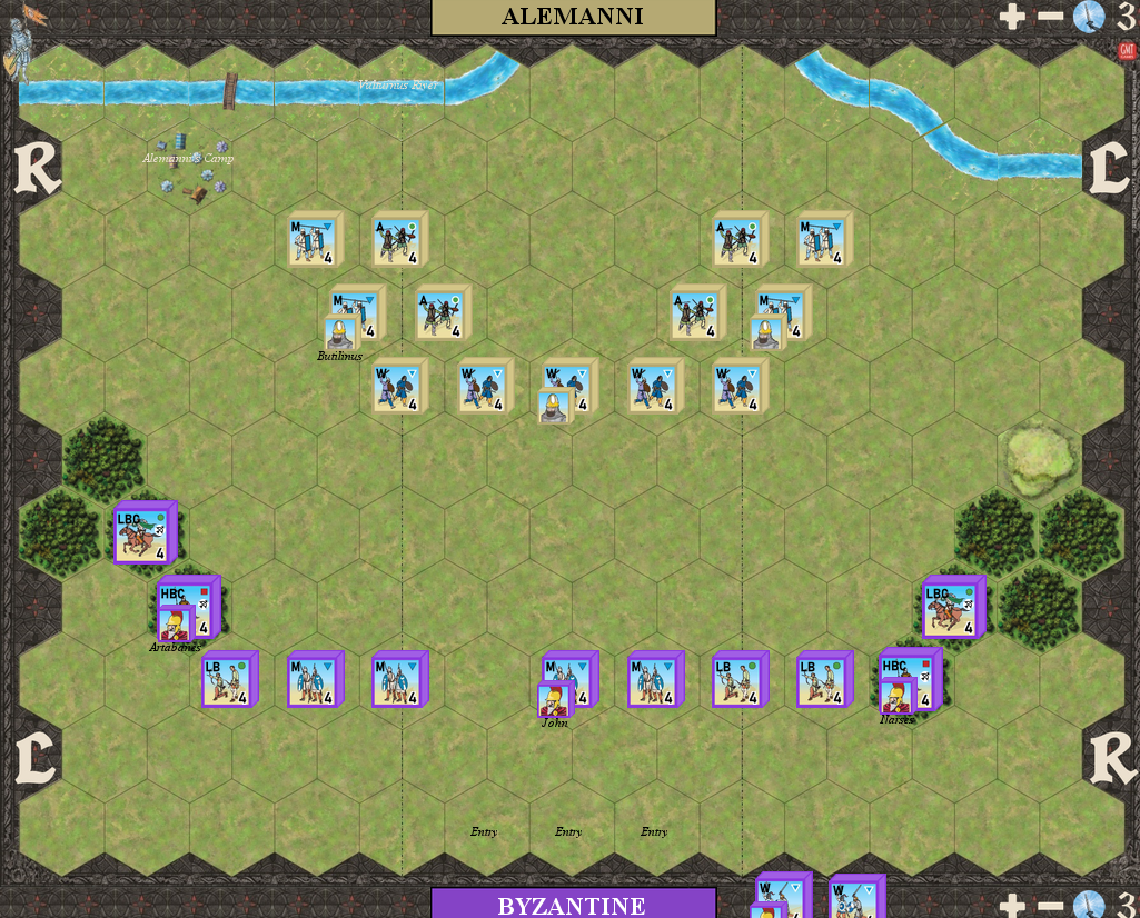 Another scenario similar to the first in that article (Taginae). Byzantines formed in a wedge, with flanks supported by the terrain, ready to meet the barbarian charge.