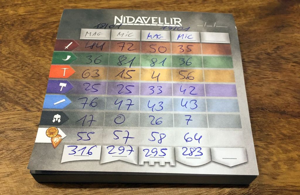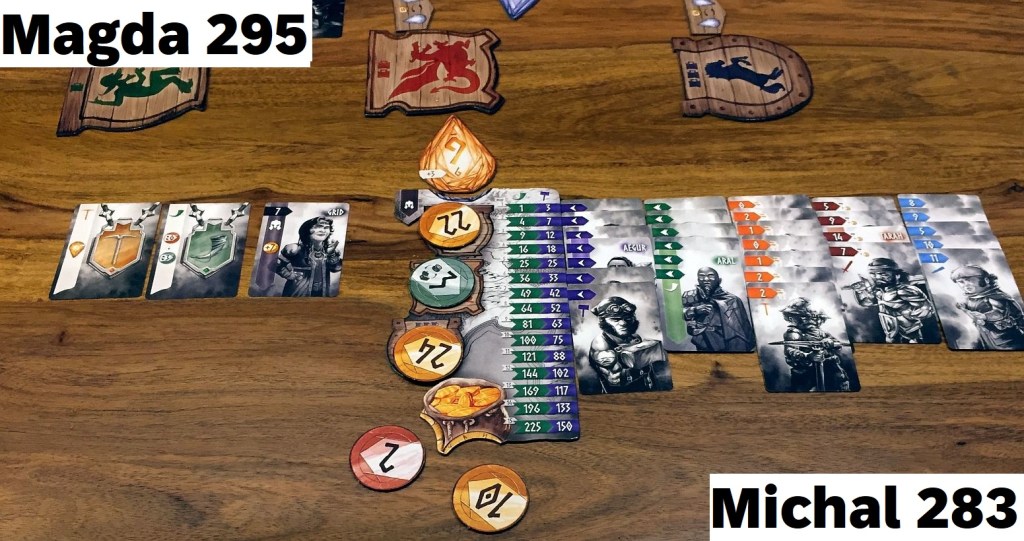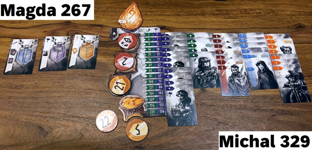 As you can see above, Magda was definitely a better learner. In that game you do not only get the individual points for each class of dwarfs – blacksmiths, hunters, warriors, explorers and miners. You can also get a hero, each time you complete a line of cards with all 5 types. That hear is not only a powerful and VPs-rich addition but can as a result also trigger hiring of another hero! She really perfected that approach 🙂
