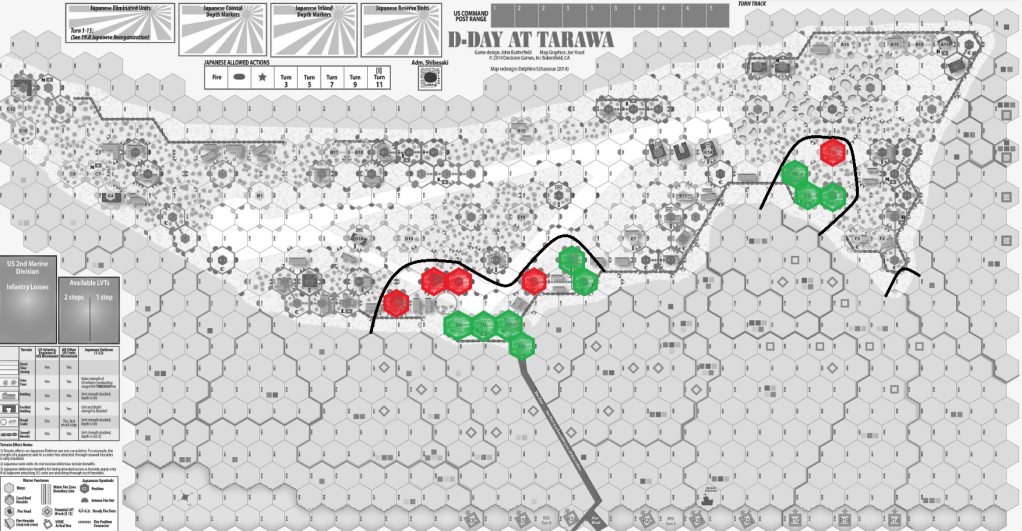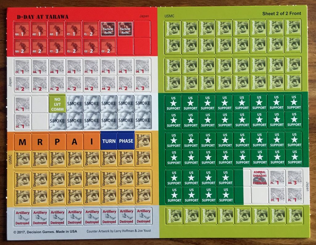Time to tell something more about the game itself. It is based on John Butterfield’s groundbreaking D-Day at Omaha Beach system and presents the critical days of fighting at platoon and company scale in solitaire mode. You command the invading American forces against dug-in Japanese defenders, which are controlled by the game system. Tarawa covers the landings on Betio Island in November 1943, and the operations of the US 2nd Marine and 27th Infantry Divisions to clear it — the first heavily contested landing of the Pacific War. The battle for the tiny Island raged for four days and, when it was finally over, fewer than 200 of the 5,000 Japanese defenders remained alive.