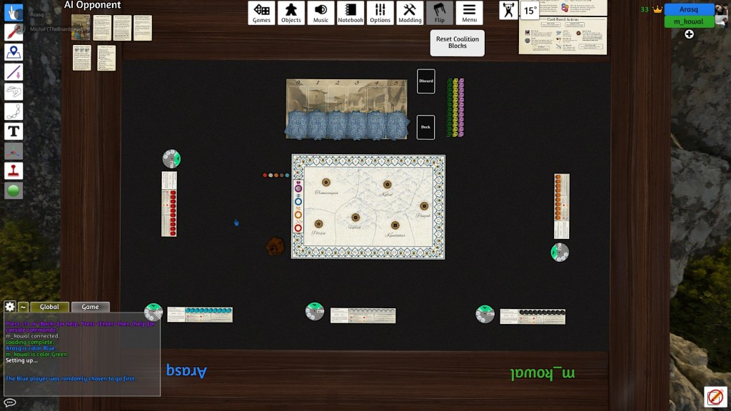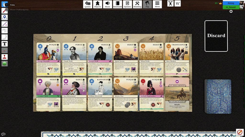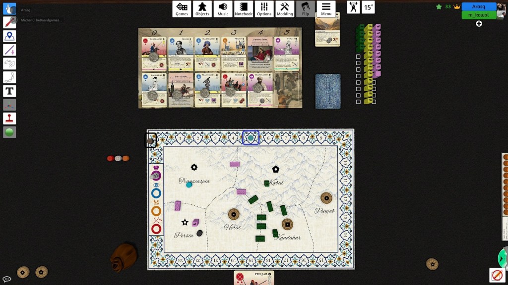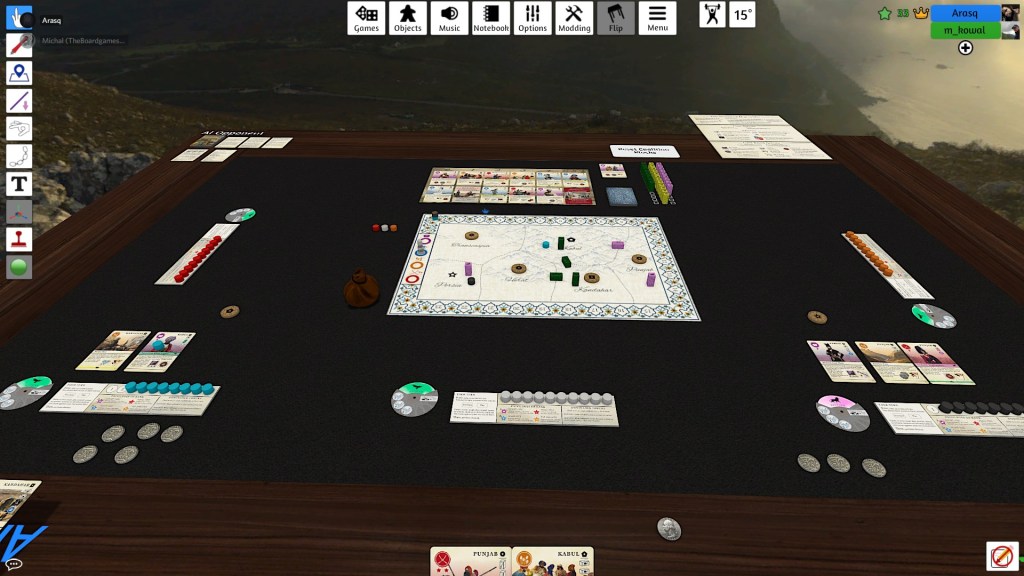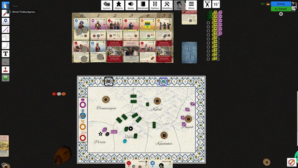 My second and third attempt was supposed to be in a larger group but finally we played only with Marek. There was no chance to meet live so we have chosen Tabletop Simulator. And interesting observation here – many games have fantastic and beautiful TTS implementation, rivaling in graphical dimension with their boxed versions. Not in case of Pax Pamir – while module is fine, the real game have such a superb quality components – especially map, armies and roads – that nothing compares to live game.