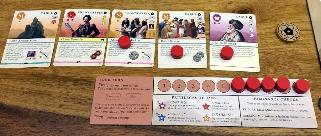 In terms of game play, Pax Pamir is a pretty straightforward tableau builder. Players spend most of their turns purchasing cards from a central market, then playing those cards in front of them in a single row called a court. Playing cards adds units to the game’s map and grants access to additional actions that can be taken to disrupt other players and influence the course of the game. That last point is worth emphasizing. Though everyone is building their own row of cards, the game offers many ways for players to interfere with each other directly and indirectly.