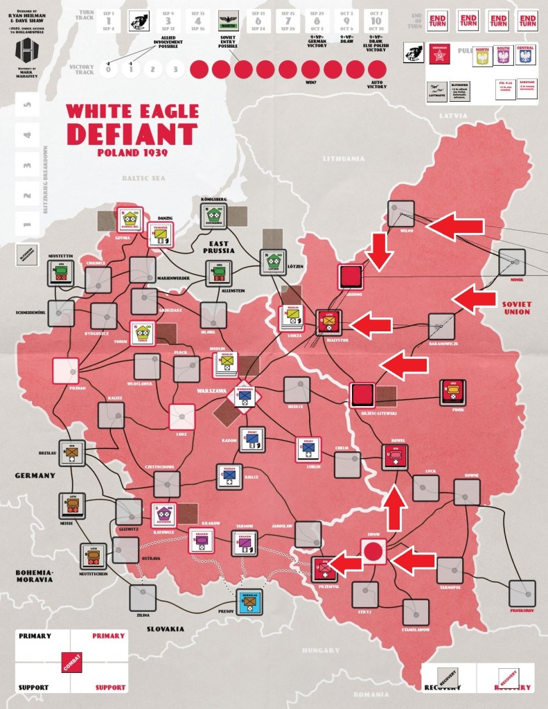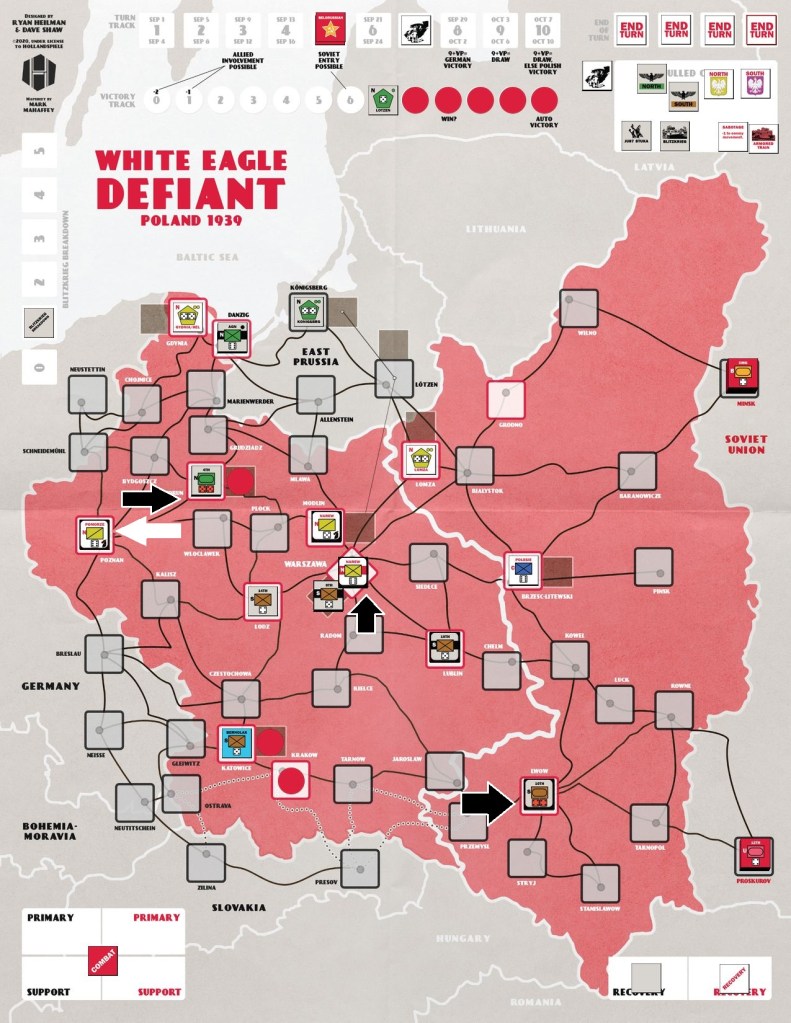 Since it publication in September 2020 I am playing White Eagle Defiant on a pretty regular basis. The game is fantastic both as a 2-players wargame but also as a solitaire challenge. To prolong its longevity and fun steaming from it I also created set of fan-made scenarios. Not so long time ago I had a possibility to work with the game designer – Ryan Heilman – on a Vassal module to the game. It is already published (see here: VASSAL Module) and incorporates also the mentioned 4 hypothetical scenarios.