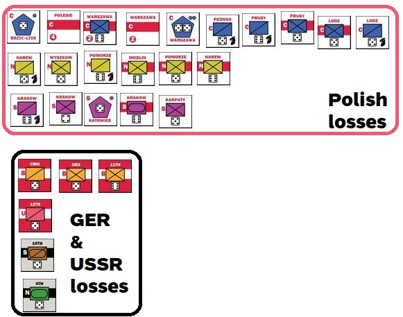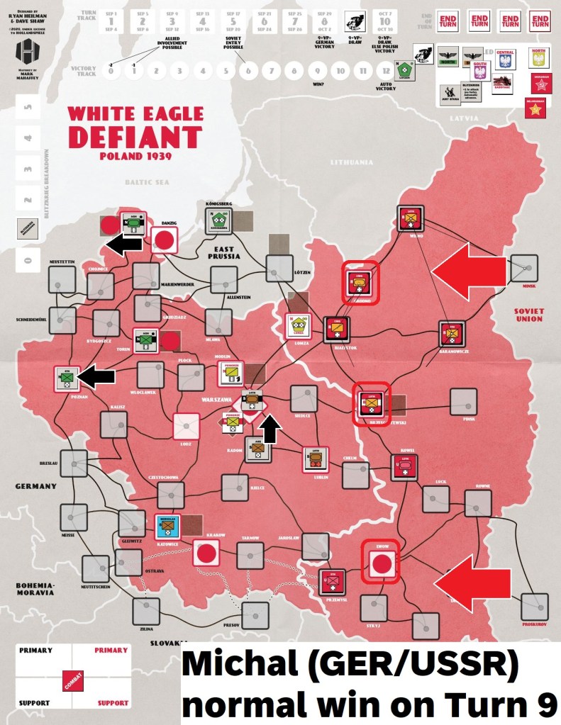 In this game one player controls the Germans, Slovaks and Soviets while the other commands the Poles. The German objective is to gain control of Warsaw and other designated Victory cities while preventing Polish forces from destroying their forts in East Prussia and recapturing Victory cities. If the German player does so in less time than the historical campaign, they win the game. Anything less is a draw or a win for the Polish player.