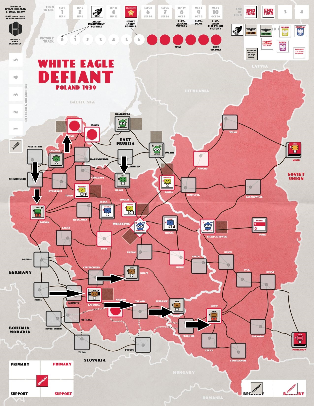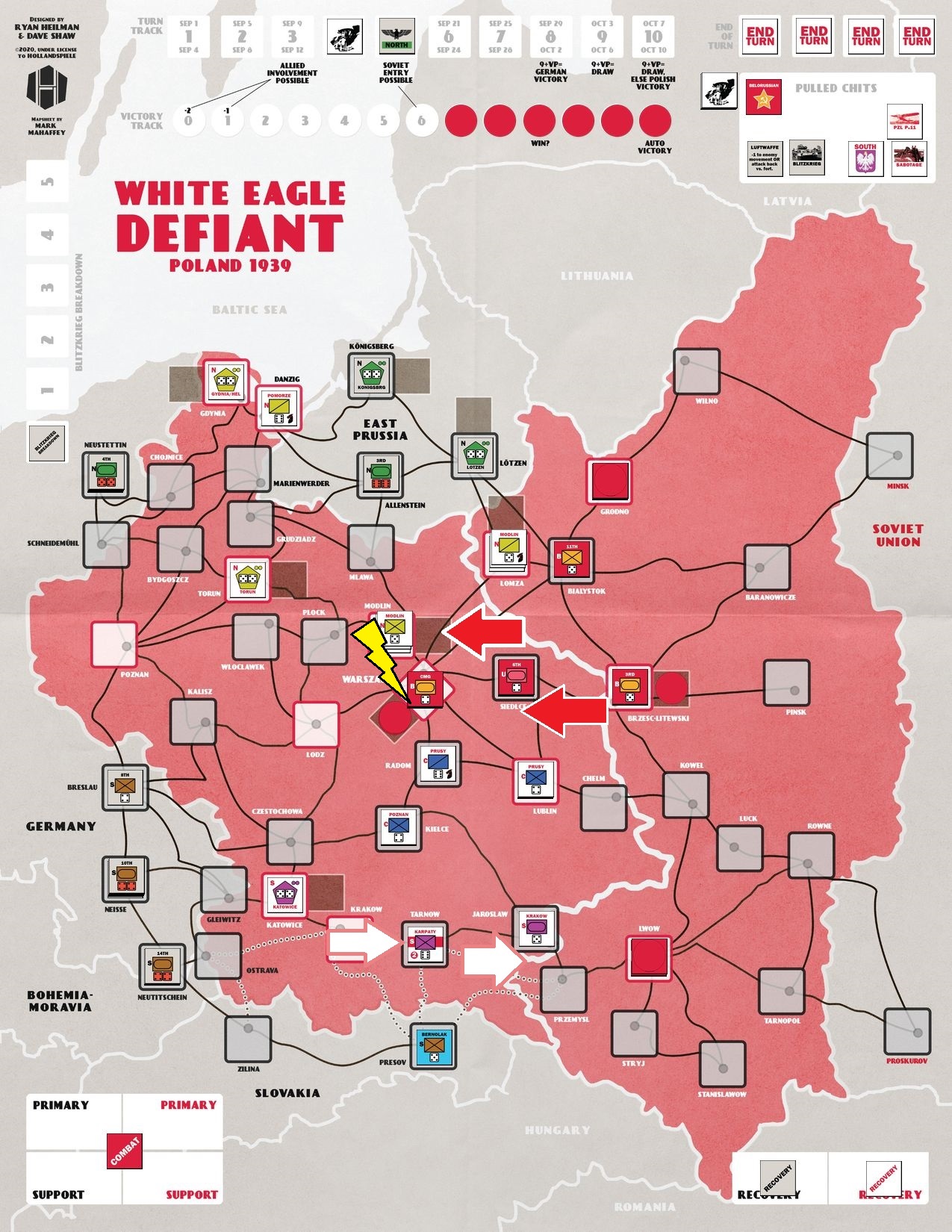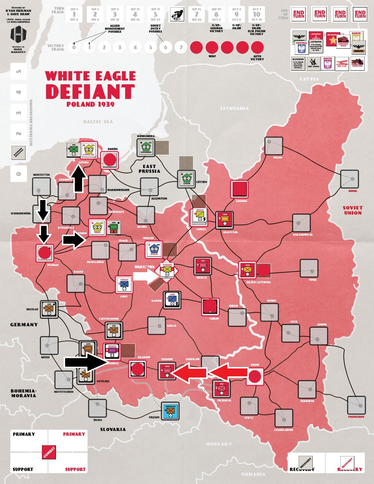 Since it publication in September 2020 I am playing White Eagle Defiant on a pretty regular basis. The game is fantastic both as a 2-players wargame but also as a solitaire challenge. To prolong its longevity and fun steaming from it I also created set of fan-made scenarios. Not so long time ago I had a possibility to work with the game designer – Ryan Heilman – on a Vassal module to the game. It is already published (see here: VASSAL Module) and incorporates also the mentioned 4 hypothetical scenarios.