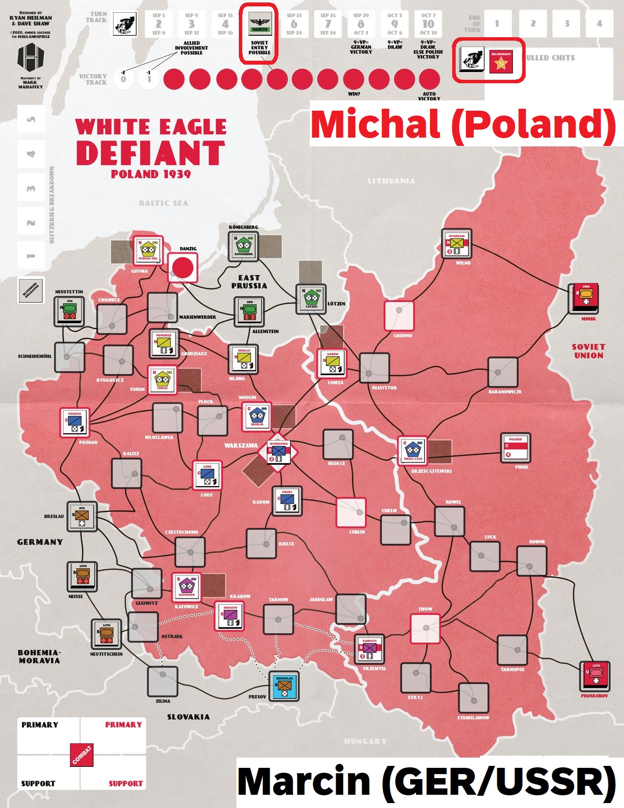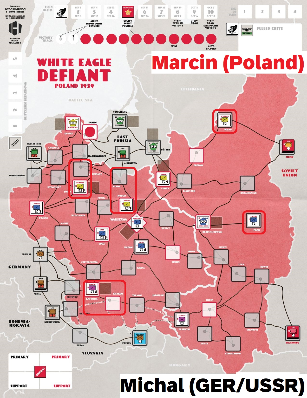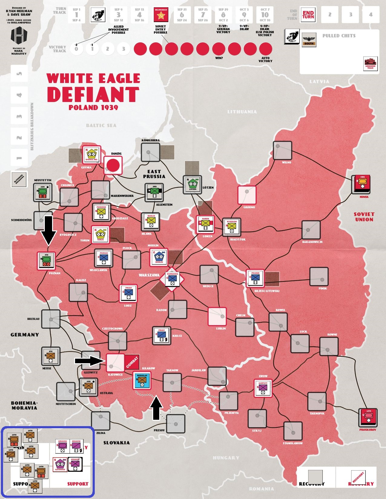 Since it publication in September 2020 I am playing White Eagle Defiant on a pretty regular basis. The game is fantastic both as a 2-players wargame but also as a solitaire challenge. To prolong its longevity and fun steaming from it I also created set of fan-made scenarios. Not so long time ago I had a possibility to work with the game designer – Ryan Heilman – on a Vassal module to the game. It is already published (see here: VASSAL Module) and incorporates also the mentioned 4 hypothetical scenarios.