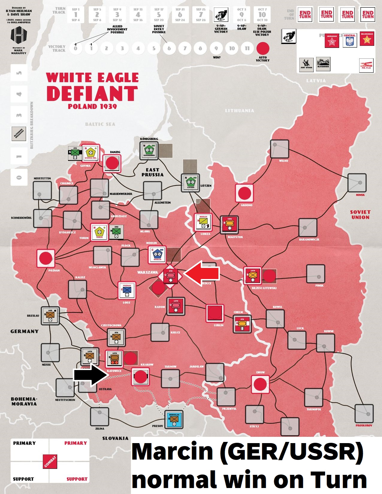 In this game one player controls the Germans, Slovaks and Soviets while the other commands the Poles. The German objective is to gain control of Warsaw and other designated Victory cities while preventing Polish forces from destroying their forts in East Prussia and recapturing Victory cities. If the German player does so in less time than the historical campaign, they win the game. Anything less is a draw or a win for the Polish player.