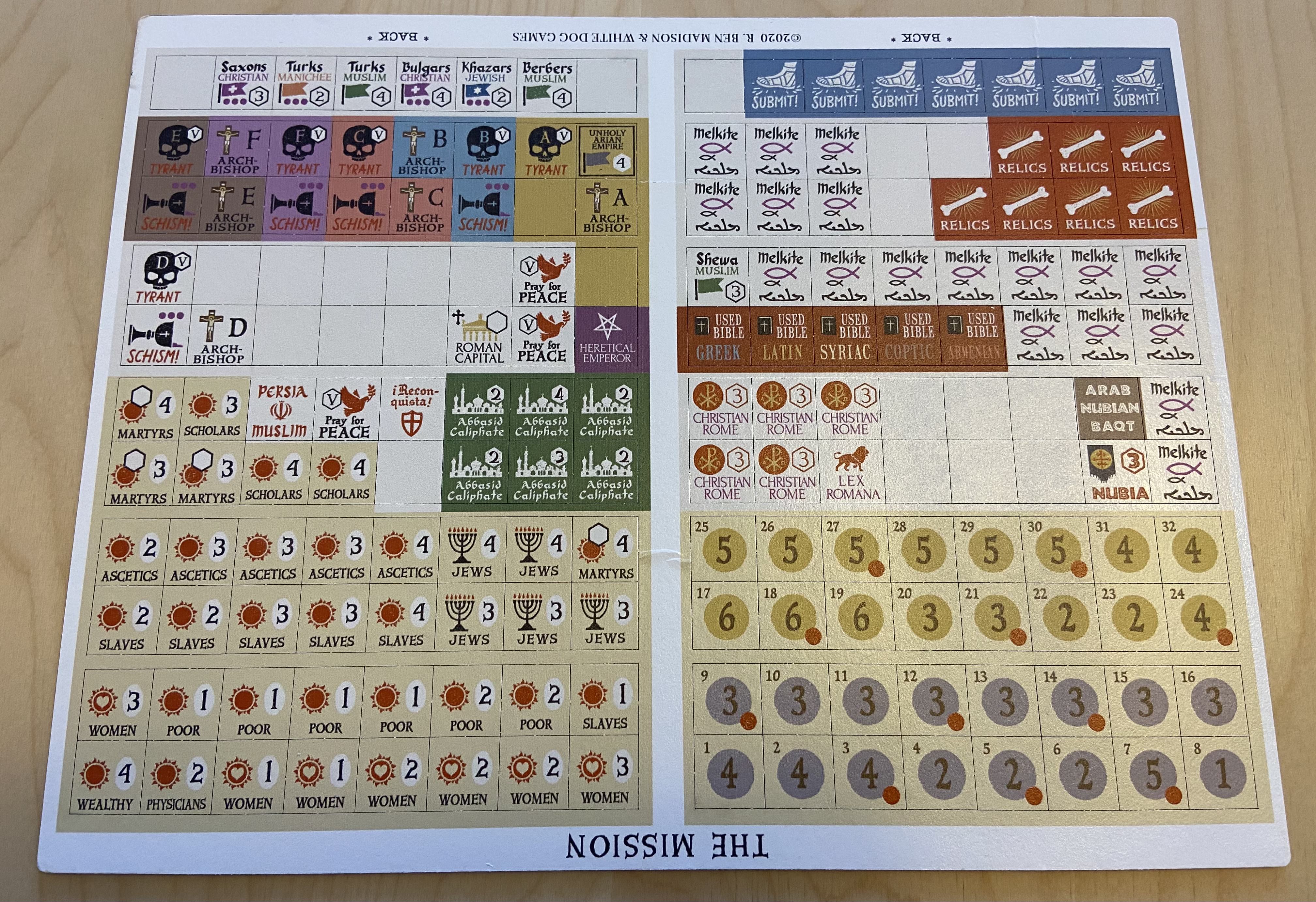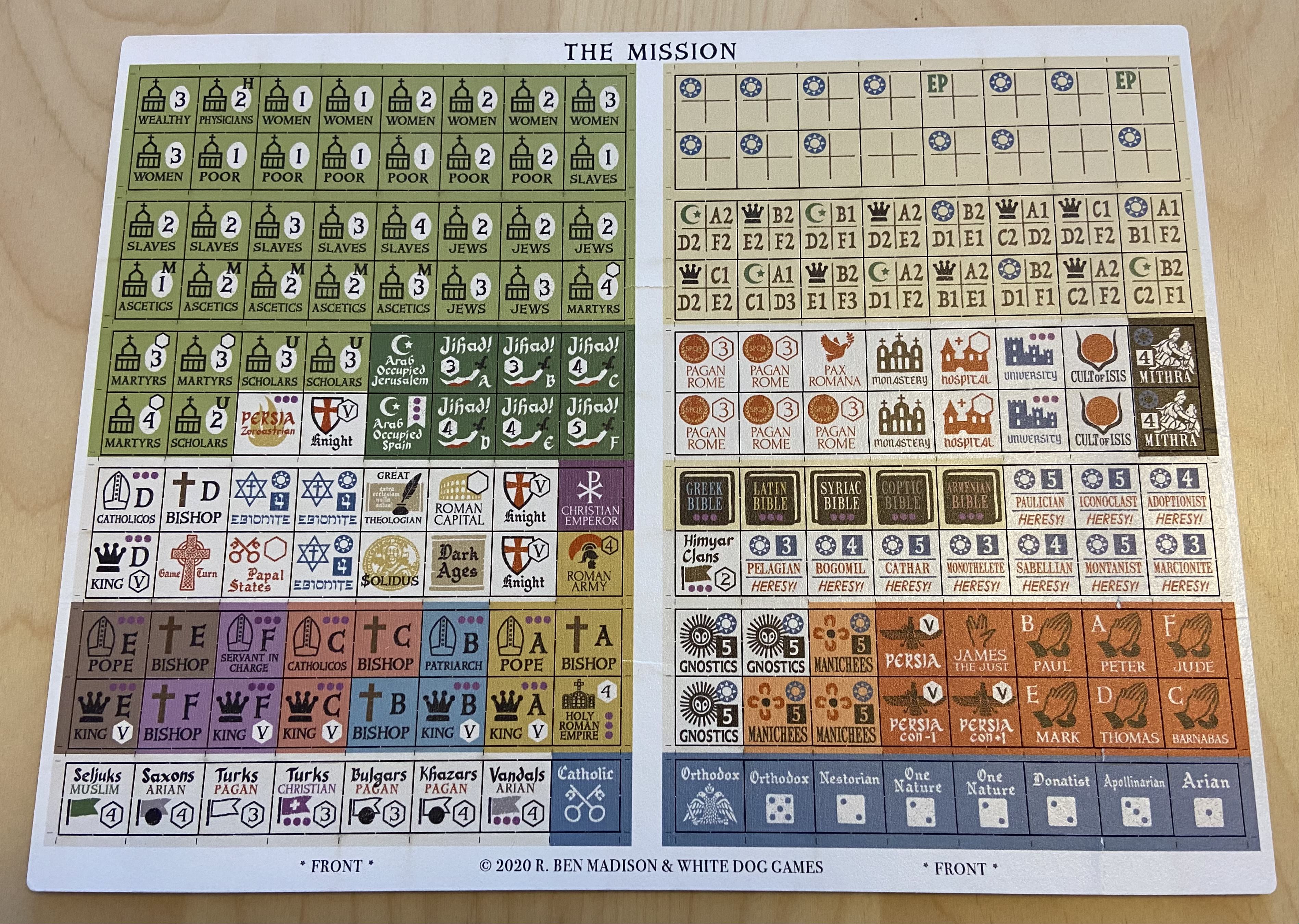 Jesus asked his disciples: “When the Son of Man returns, how many will he find on the earth who have faith?” (Luke 18:8, NLT) That question is the premise behind The Mission. The Mission: Early Christianity from the Crucifixion to the Crusades is a “grand strategy” solitaire game covering 1,200 years of Christian history on a map of the ancient Mediterranean, Near East, Europe and Africa. While the secular world of empires and politics plays out around you, your missionaries spread the Christian faith and convert areas of the map to your new religion. Each turn covers decades, and the flow of play will teach players about the expansion and doctrinal battles of early Christianity while you build institutions to educate, heal, and inspire the societies you touch.