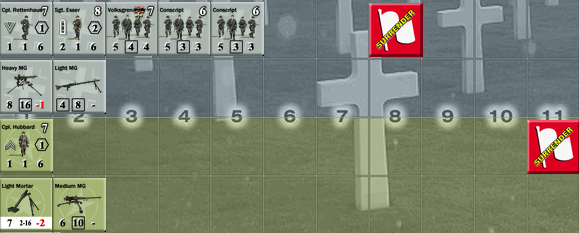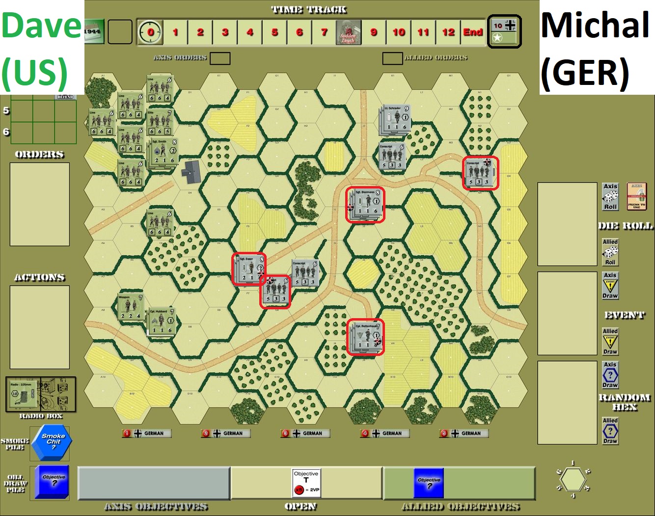 The scenario was truly interesting and exciting endeavor. Very good beginning for Germans (first turn elimination of Leader) did not break US morale and they recovered, bringing two more leaders to the battlefield (although for pretty long time we thought Lt.Thomas is an actor – his fortunes were abysmal…). The game was pretty close – like the first one – almost to the end and our multiple Sudden Death rolls on Turn 27 (I think we re-rolled like 5 times) will be long rememberd!