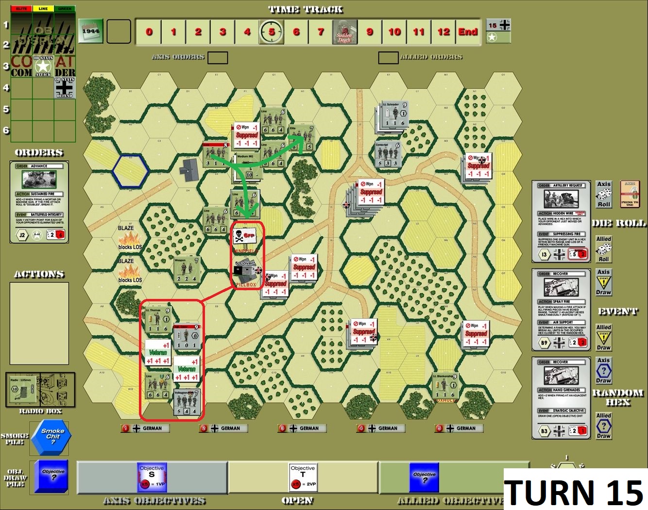 Things on southern flank are no better – artillery finishes my troops in Objective 2, northern part of US forces closes on my main defense point (I will destroy enemy MG there). Lt. Thomas enters map, but he is so pitiful. Second leader also joins Dave’s forces.