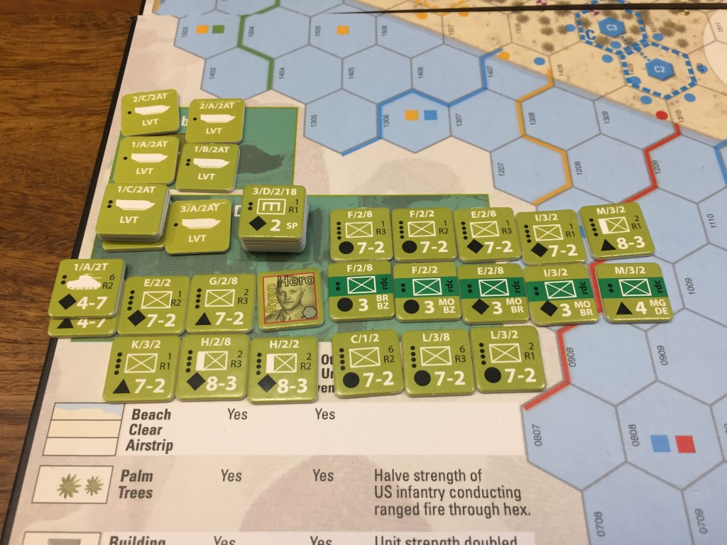 In my initial article I provided some information about the game, but for those of you who hear about the title for the first time, let me provide some needed details. It is based on John Butterfield’s D-Day at Omaha Beach system and presents the fighting at platoon and company scale in solitaire mode. You command the invading American forces against dug-in Japanese defenders, which are controlled by the game system. Tarawa covers the landings on Betio Island in November 1943, and the operations of the US 2nd Marine and 27th Infantry Divisions to clear it — the first heavily contested landing of the Pacific War. The battle for the tiny Island raged for four days and, when it was finally over, fewer than 200 of the 5,000 Japanese defenders remained alive.