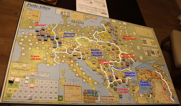 | About game: | This is another long overdue review and tribute to my favorite strategic-level wargame. There was always something more urgent to take care of or other topics to be covered. However, now the time has come so let me write about one of my favorite Card Driven Wargames of all times – Paths of Glory (PoG) from GMT Games. It was my first GMT-published title to purchase – alongside Twilight Struggle. Since my initial contact with it in 2011 I played that game umpteen times. This was in various set-ups form shorter set-ups, through whole campaign up to the special 1917 scenario. My review will be based on those experiences. Paths of Glory: The First World War, designed by Ted Raicer, allows players to step into the shoes of the monarchs and marshals who triumphed and bungled from 1914 to 1918. As the Central Powers you must use the advantage of interior lines and the fighting skill of the Imperial German Army to win your rightful ‘place in the sun.’ As the Entente Powers (Allies) you must bring your greater numbers to bear to put an end to German militarism and ensure this is the war ‘to end all wars.’ Both players will find their generalship and strategic abilities put to the test as Paths of Glory’s innovative game systems let you recreate all the dramatic events of World War I. In order to achieve victory players attempt to attack their opponent’s key areas, scoring points for terrain objectives. The war escalates with time and more and more countries enters it. Be be ware – if the belligerent losses its capital it can be conquered and his armies dissolved. In the end, the ultimate goal is to force the other side to surrender and sue for peace – a feat possible only when tremendous advantage on front lines is achieved. You will experience Bolshevik revolution, US entry into war, escalation from Mobilization, through the Limited to Total War. Each turn a tough choice will stand in front of you – how to use the strategy card – for operations, even, replacement points or maybe strategic redeployment? Would you stand-up to the task and manage to prevail against your opponent? |