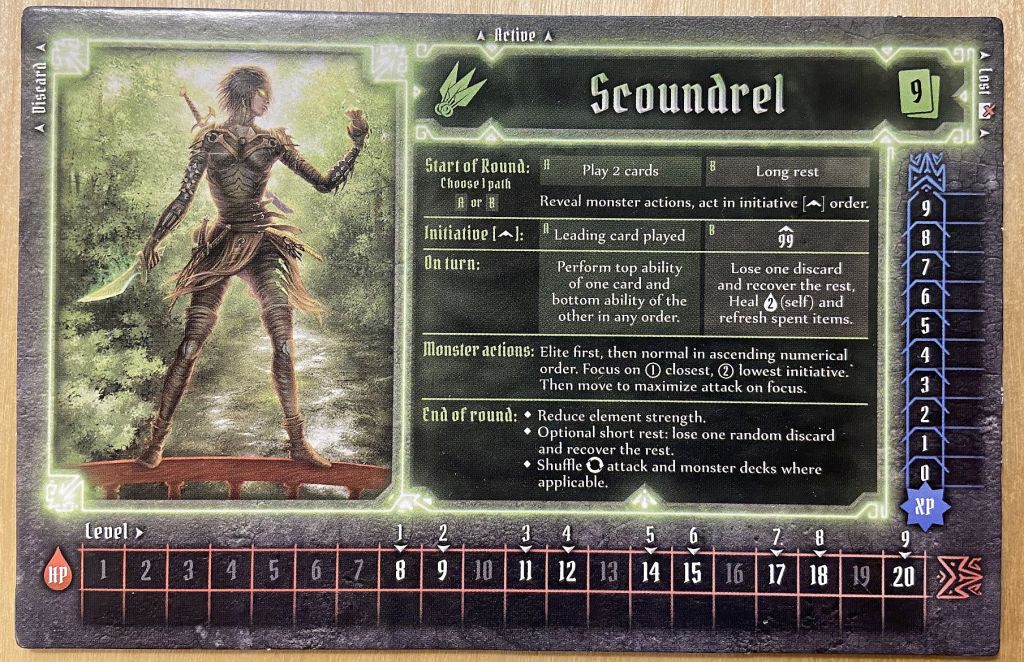 Recently my Scoundrel finally reached level 9 and although I still have couple of scenarios before I will retire, I thought it justifiable to already share my experiences with that great melee damage dealer. As our group is pretty experienced now – and this is my 3rd character in current campaign – I was able to start already at level 5. That of course helped a lot, as from the start I had much more powerful character, more money for items and possibility to play Solo bonus scenario! It took me 11 games to reach from level 5 to level 9 – that is also some indication how fast the Scoundrel can gain experience. Of course, this is my subjective take and preference, but I hope you will find it useful. But first things first – let us talk about her class.