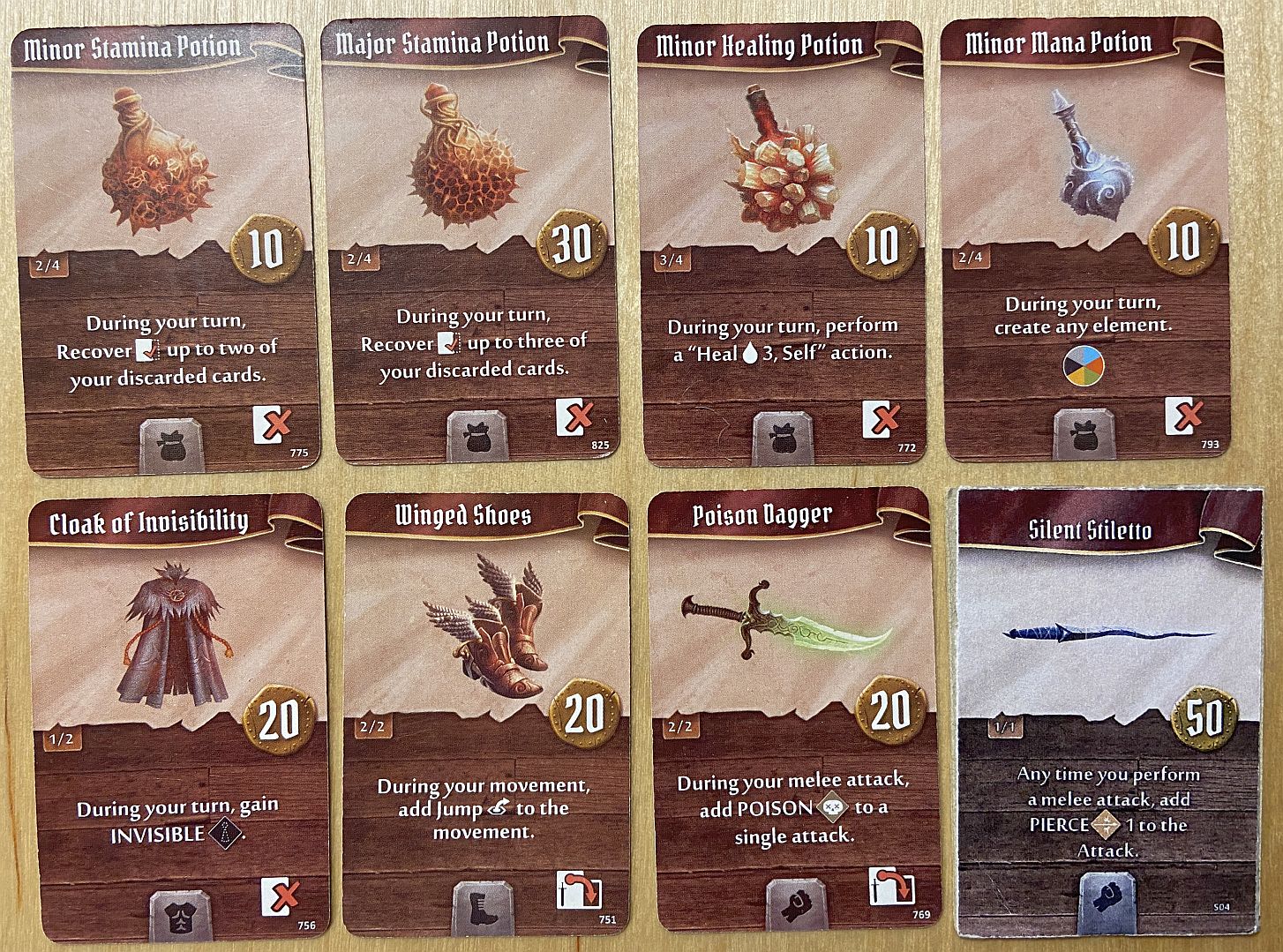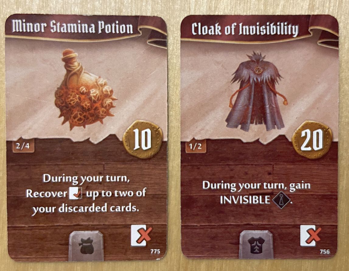 - Major Stamina Potion – another 3 cards which can be retrieved from discard pile, so additional 1.5 turn in each scenario – and with odd number of cards at the beginning for Scoundrel (9) even two additional turns. I am buying it whenever it is available (and my character has a free slot for a small item). With 9 cards stamina this is a “must-have” for Scoundrel