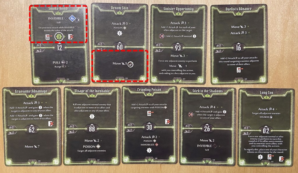 - Smoke Bomb – I added Strengthen on the top. That card can generate one of the most powerful – although one-time – attacks by Scoundrel so you really want this ti be a hit.