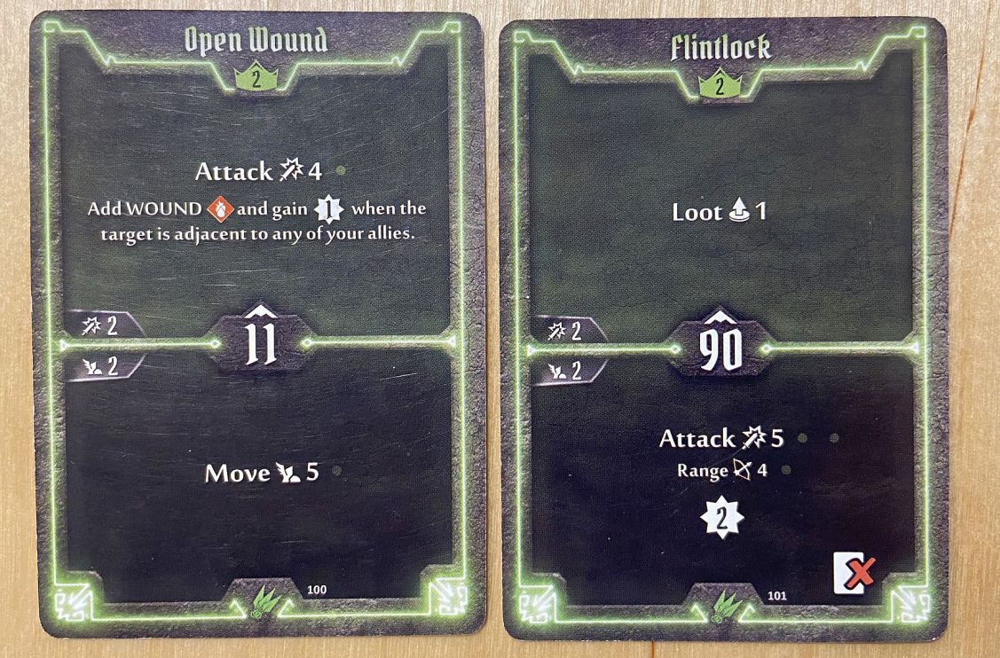 - Level 2 – I took Open Wound over Flintlock; reason: the former is simply fantastic – great top, with exp and wound; very good move at the bottom. Also, pretty fast initiative. The latter had a terrible loss at the bottom. Loot at the top is actually very good should you need money. But not at such a trade-off.