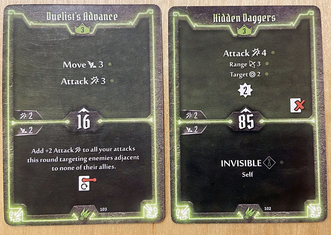 - Level 3 – I took Duelist Advance over Hidden Daggers; reason: the former is a pure upgrade to Quick Hands, and you really need to have that fantastic ability to move and attack at the top – closing on enemy, hitting, and using other card to retreat. I regretted not taking Hidden Daggers only for its bottom, top is not very useful.