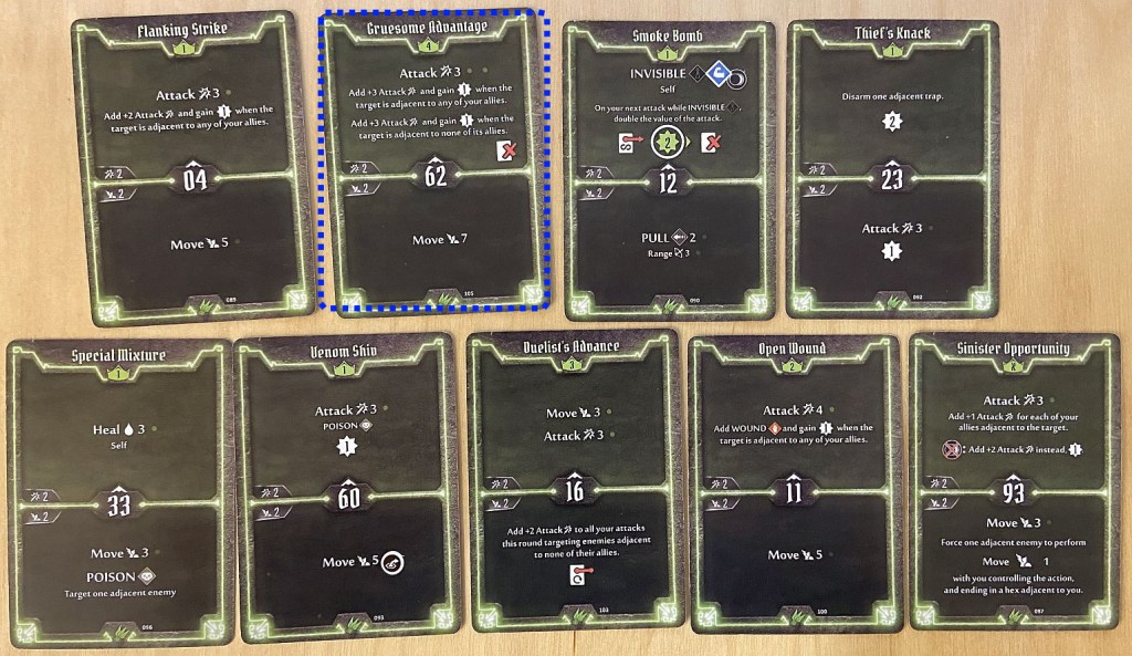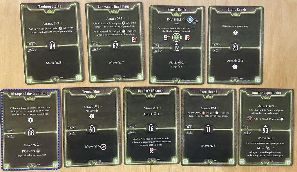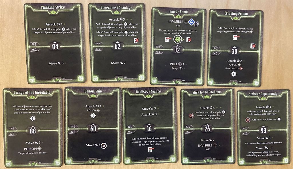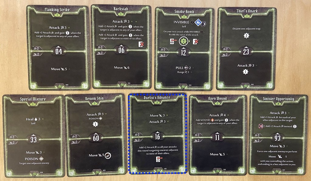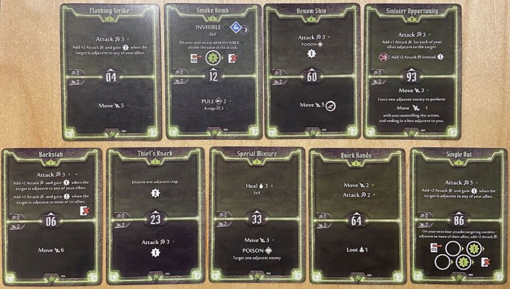 - Initiative – for Scoundrel we should not try to only look how fast she is (and very fast she can be – with cards like 02, 04 or 06 initiative) but also how slow too (cards like 88 or 93). As we shall see later in the article, the silent killer moving very late in the turn and then very early in the next one can have two uninterrupted attacks which rarely any enemy can survive.
