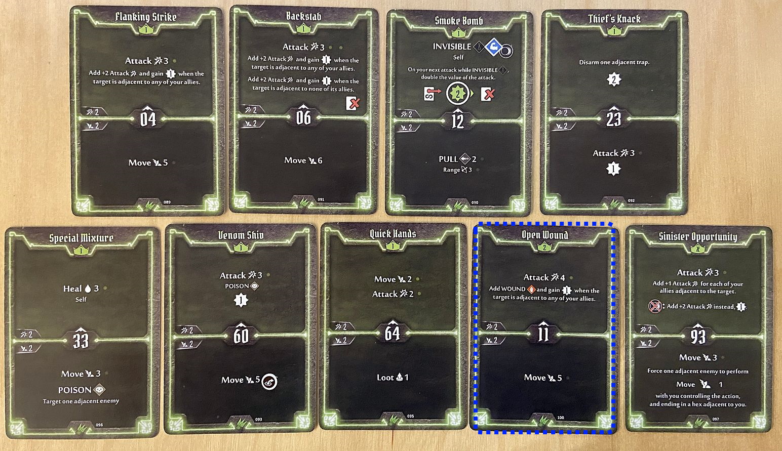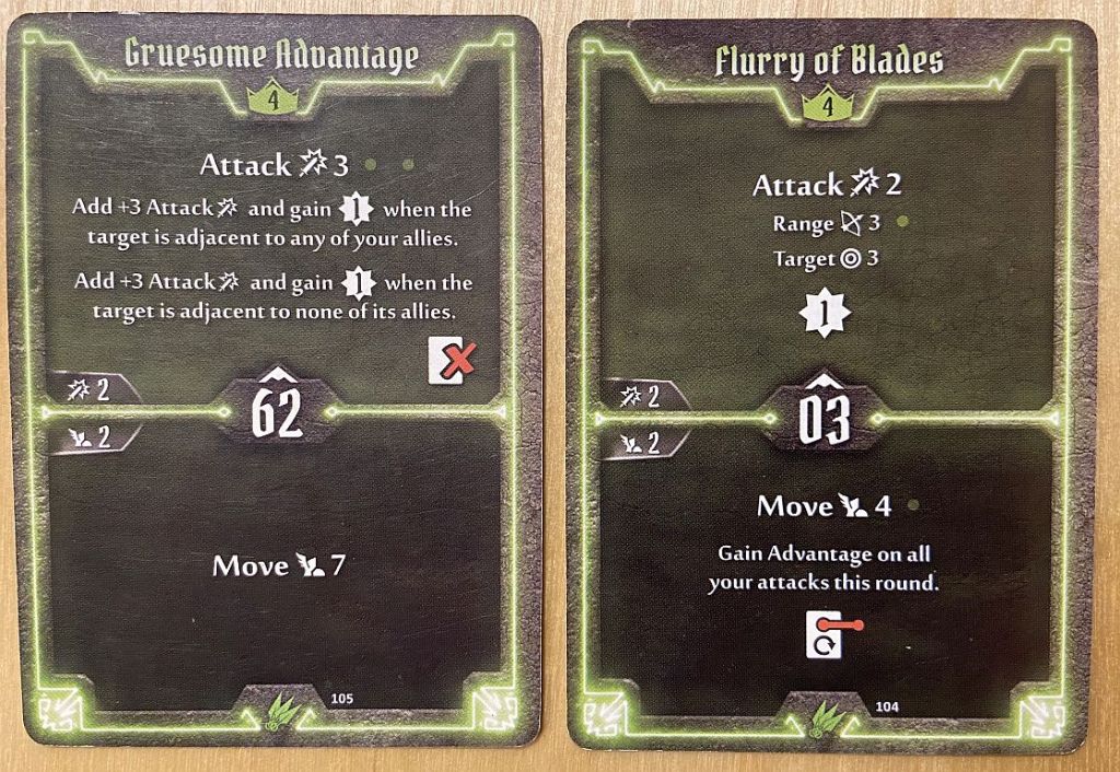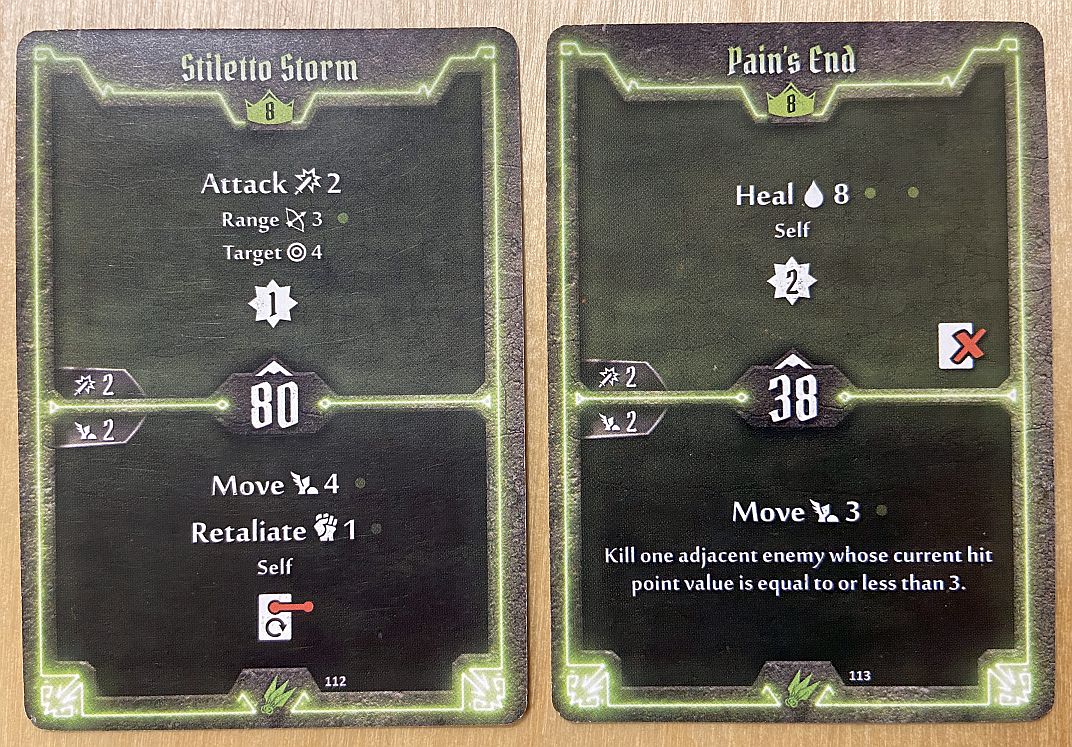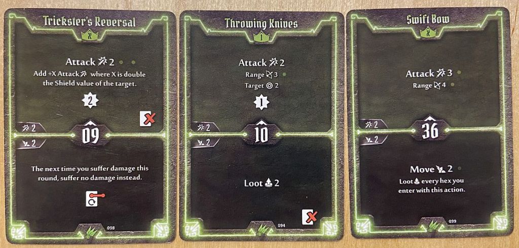 - Initiative – for Scoundrel we should not try to only look how fast she is (and very fast she can be – with cards like 02, 04 or 06 initiative) but also how slow too (cards like 88 or 93). As we shall see later in the article, the silent killer moving very late in the turn and then very early in the next one can have two uninterrupted attacks which rarely any enemy can survive.