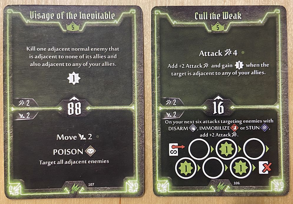 - Level 5 – I took Visage of the Inevitable over Cull the Weak; that was easy. Visage is such a powerful card – top is fantastic for immediate destruction of all normal enemies, giving exp and being a non-lost! The bottom is superb for poison-based build, as you can approach enemies, poison them and then attack. Cull the Weak has good top and lost at bottom – with Scoundrel stamina we really avoid lost cards!