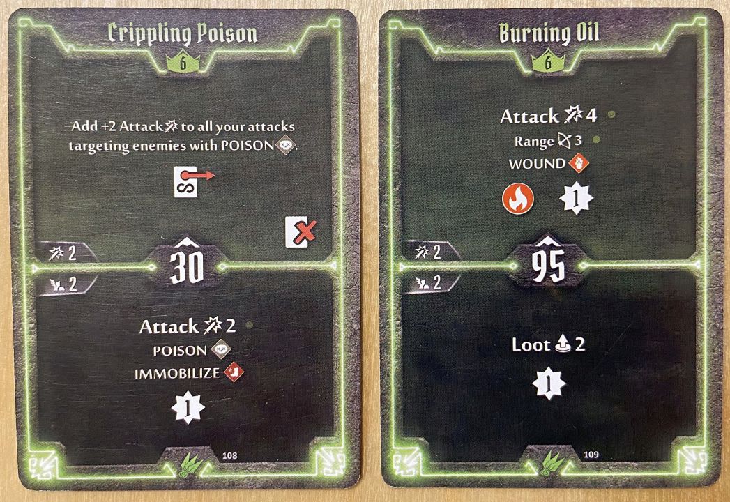 - Level 6 – I took Crippling Poison over Burning Oil; reason: this is where Scoundrel starts to shine; the Oil has sum advantages – let us be hones, spreading wound is always good; at that moment in game you should have most of items purchased so bottom Loot is useless. On the other hand, Poison is the only lost card which – even if used early – will turn your character in a true killing machine, providing +3 to each attack on enemy with such condition and allow you to finish scenario before you get exhausted. And this is exactly the style of my group – the best defense is to kill enemies so they cannot attack you… and do it quickly!