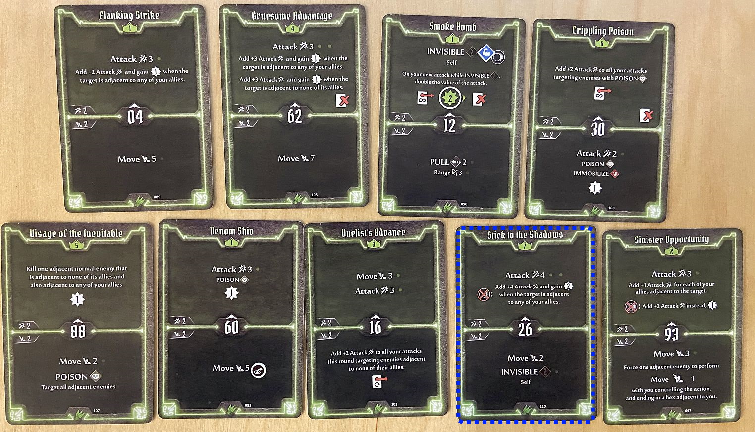 - Sinister Opportunity bottom (so you can direct adjacent enemy on new hex) and then any card which has bonus for adjacency of target to your allies / lack of adjacency to other enemies