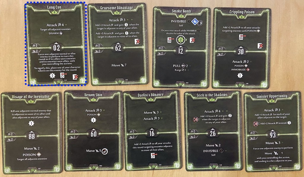 We are getting now to the “meat” of my build – a close combat, poison focused, melee damage dealer. That required some specific choices in the cards