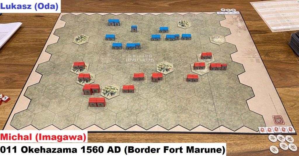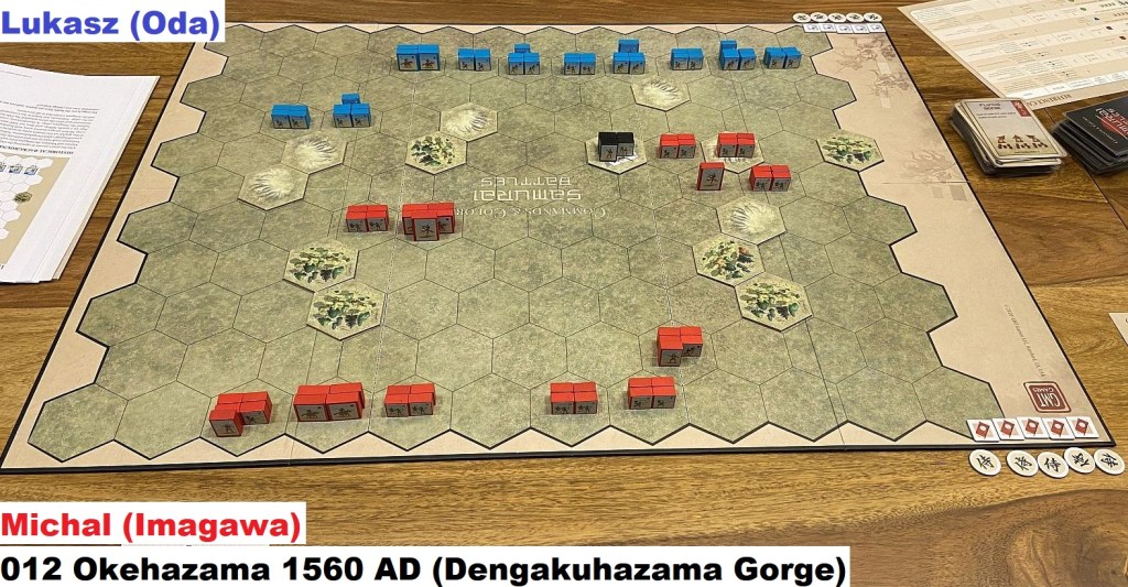 This time I had a possibility to introduce new player to C&C Samurai Battles – Lukasz. We first played the Scenario 1 – the training one, and then plunged into the historical battle of Okehazama. This two-scenarios battle is quite well suited for the introductory games, with both sides having possibility to win at least one engagement. Not to mention it is historically important! Let us see how it went – Michal (Imagawa) vs Luaksz (Oda).