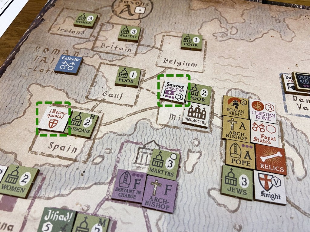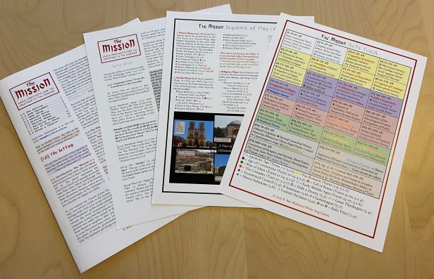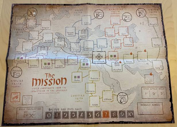 Jesus asked his disciples: “When the Son of Man returns, how many will he find on the earth who have faith?” (Luke 18:8, NLT) That question is the premise behind The Mission. The Mission: Early Christianity from the Crucifixion to the Crusades is a “grand strategy” solitaire game covering 1,200 years of Christian history on a map of the ancient Mediterranean, Near East, Europe and Africa. The game publisher is the White Dog Games and was designed by Ben Madison.