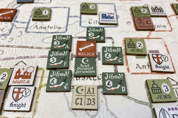 Still, in my opinion, the strongest feature of the game are the various epoch through which the games leads the player – from Apostles times, through Pagan and then Christian Roman empire, barbarians invasions, raise of Jihad and its transformation into Abbasid caliphate. Each of those plays completely differently – initially, you focus purely on faith, but with time the politics start to play more and more important role. The mechanics changes, the challenges too. This is why the game keeps you interested through as much as 27 turns! This is fantastic piece of design!